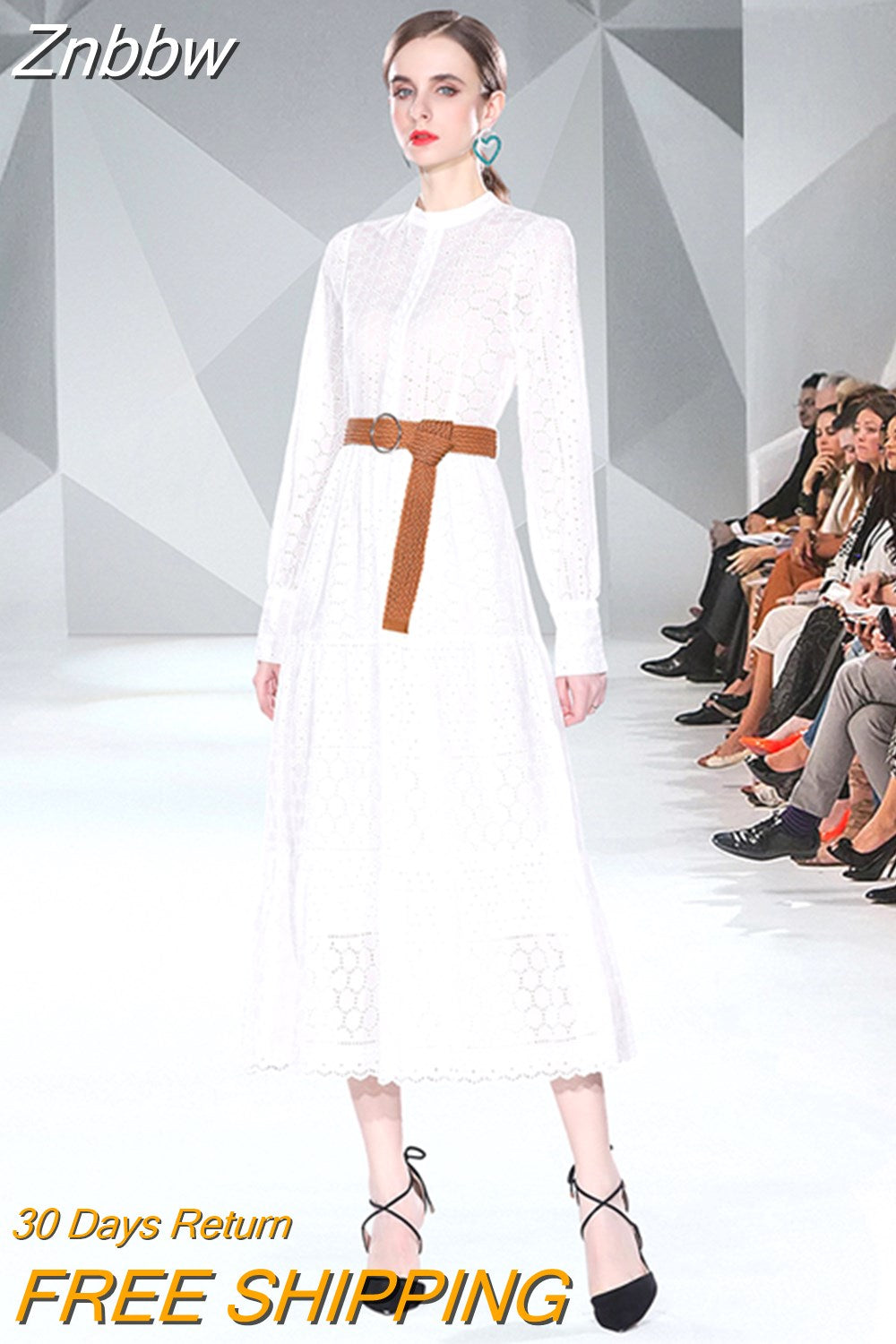 Znbbw 2023 Spring Embroidery Long Dress Women White Black Green Hollow Out Single Breasted Long Sleeve Ladies Party Dress