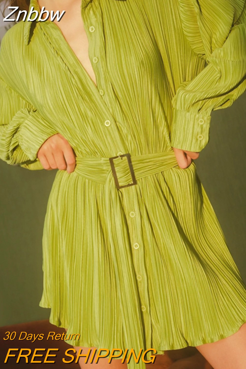 Znbbw Elegant Long Sleeve Shirt Dress Women Casual Blouse Dresses Sexy Loose Single Breasted Waistband Pleated Mini Dress
