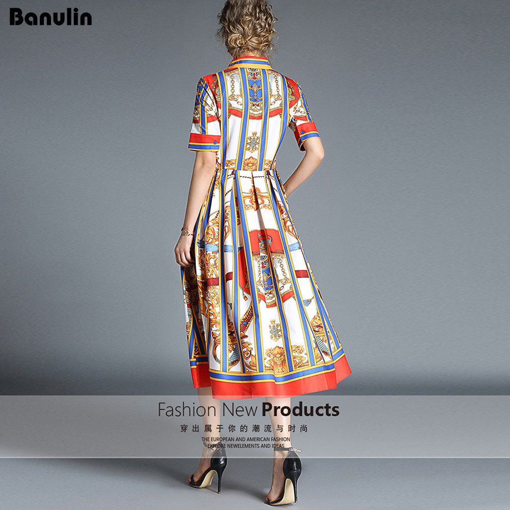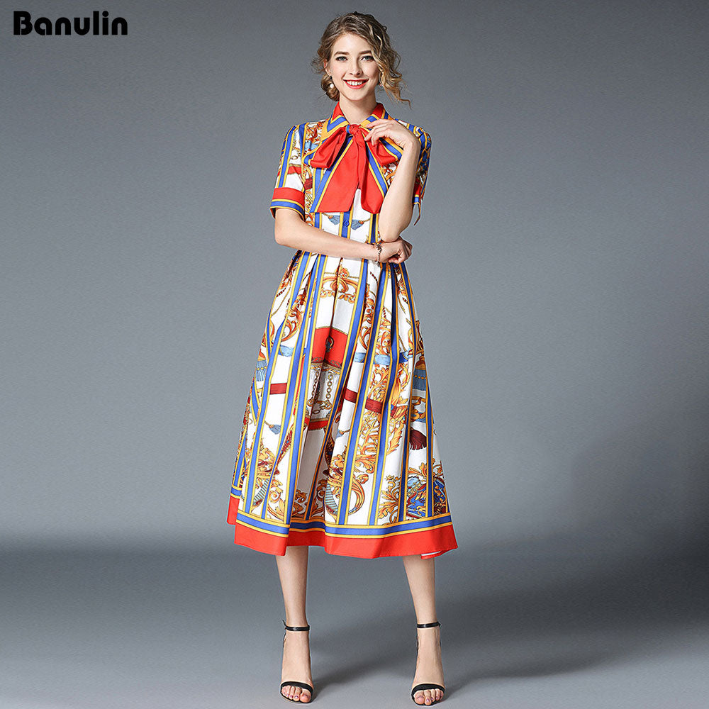 Znbbw HIGH QUALITY 2023Newest Runway Designer Summer Dress Women's Short Sleeve Shirt Collar Stripe Printed Bow Midi Dress