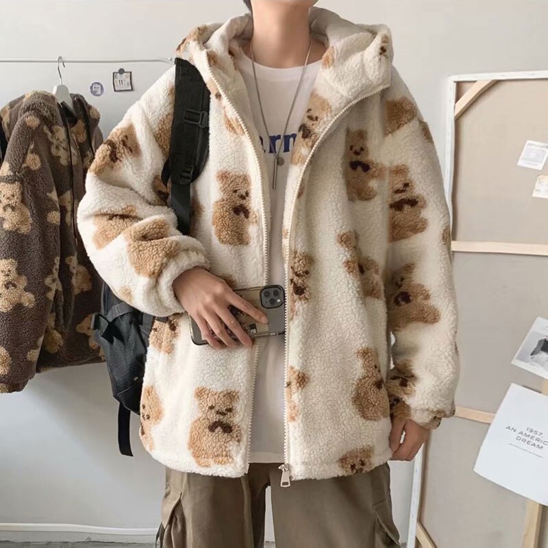 Znbbw Men Cartoon Bear Lamb Wool Hooded Coat Casual Oversized Zip Up Sweatshirt Tops 2023 Winter Men Hoodie Jacket Cute Korean Outwear