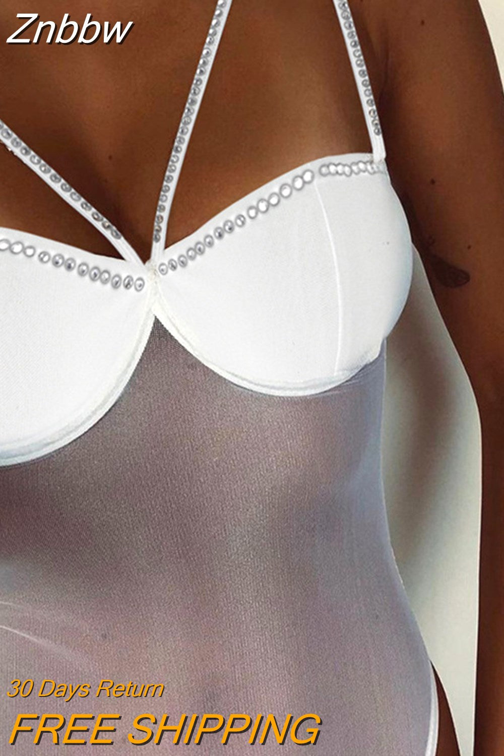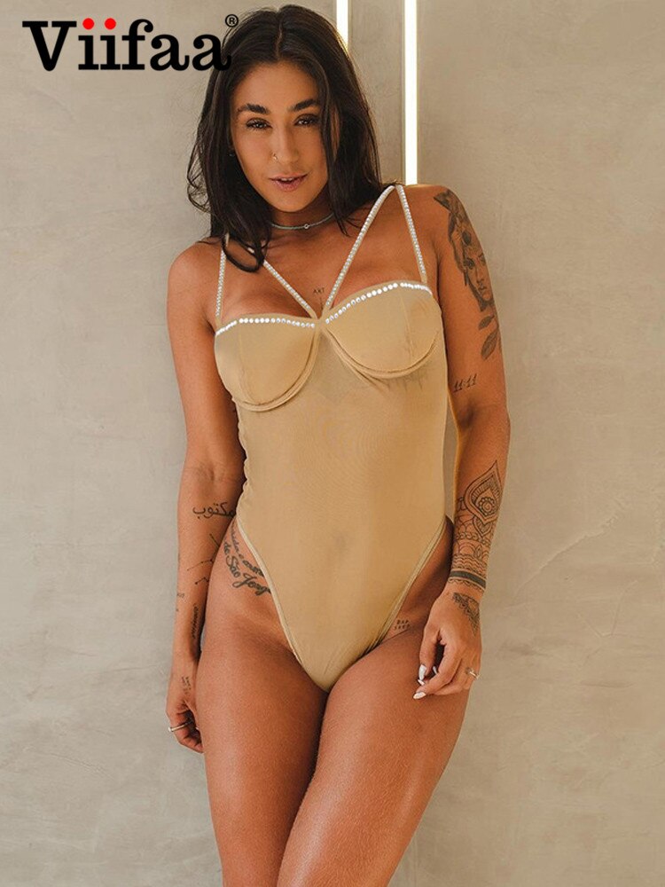 Znbbw Rhinestone Detail Sexy Top See Through Mesh Bodysuit Women Rave Festival Clothing One-Pieces Clubwear Outfit
