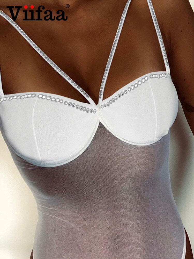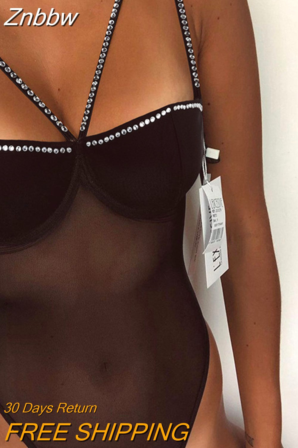 Znbbw Rhinestone Detail Sexy Top See Through Mesh Bodysuit Women Rave Festival Clothing One-Pieces Clubwear Outfit