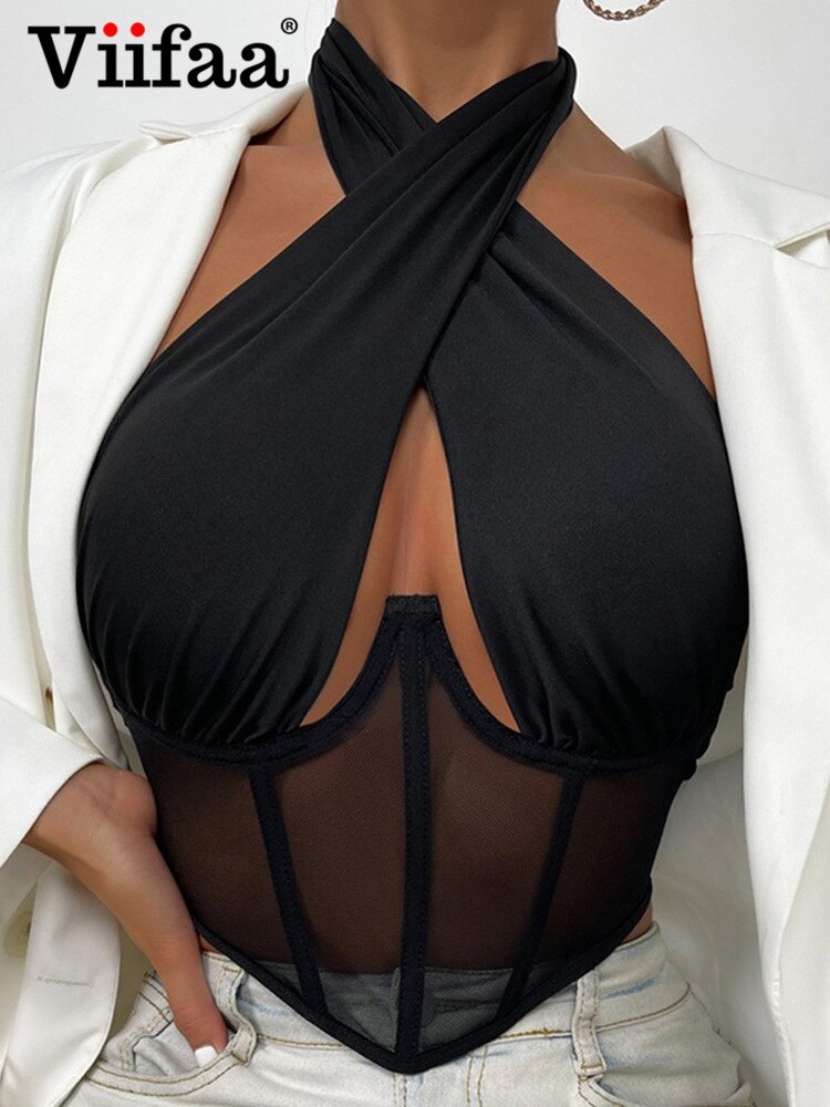 Znbbw Sexy Hollow Out Criss-Cross Halter Mesh Corset Top Women Clubwear 2023 Summer Clothes Backless Black Tank Tops