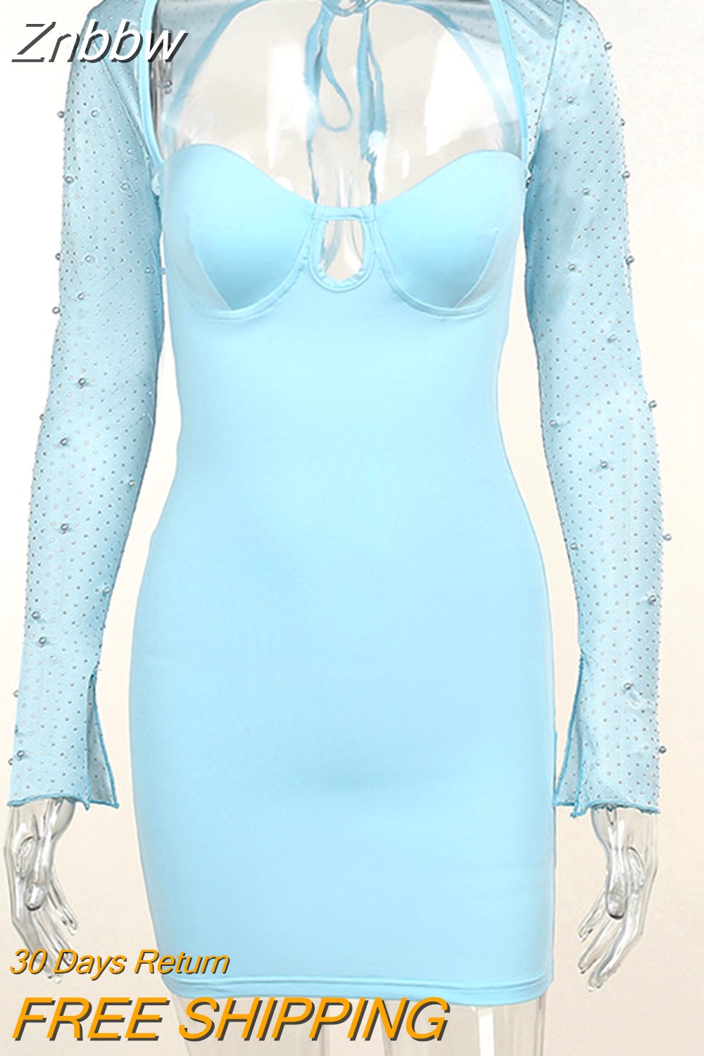 Znbbw Sexy Strapless Hollow Out Ruched Mini Dress For Women Robe Autumn Pearl Full Sleeve Bodycon Club Party Dress Vestido
