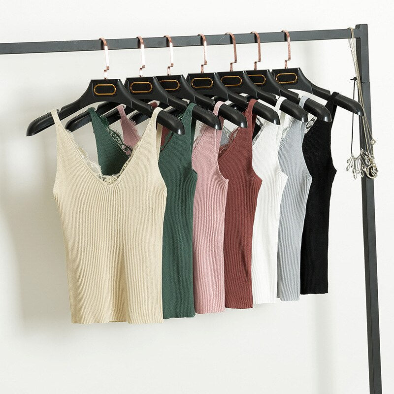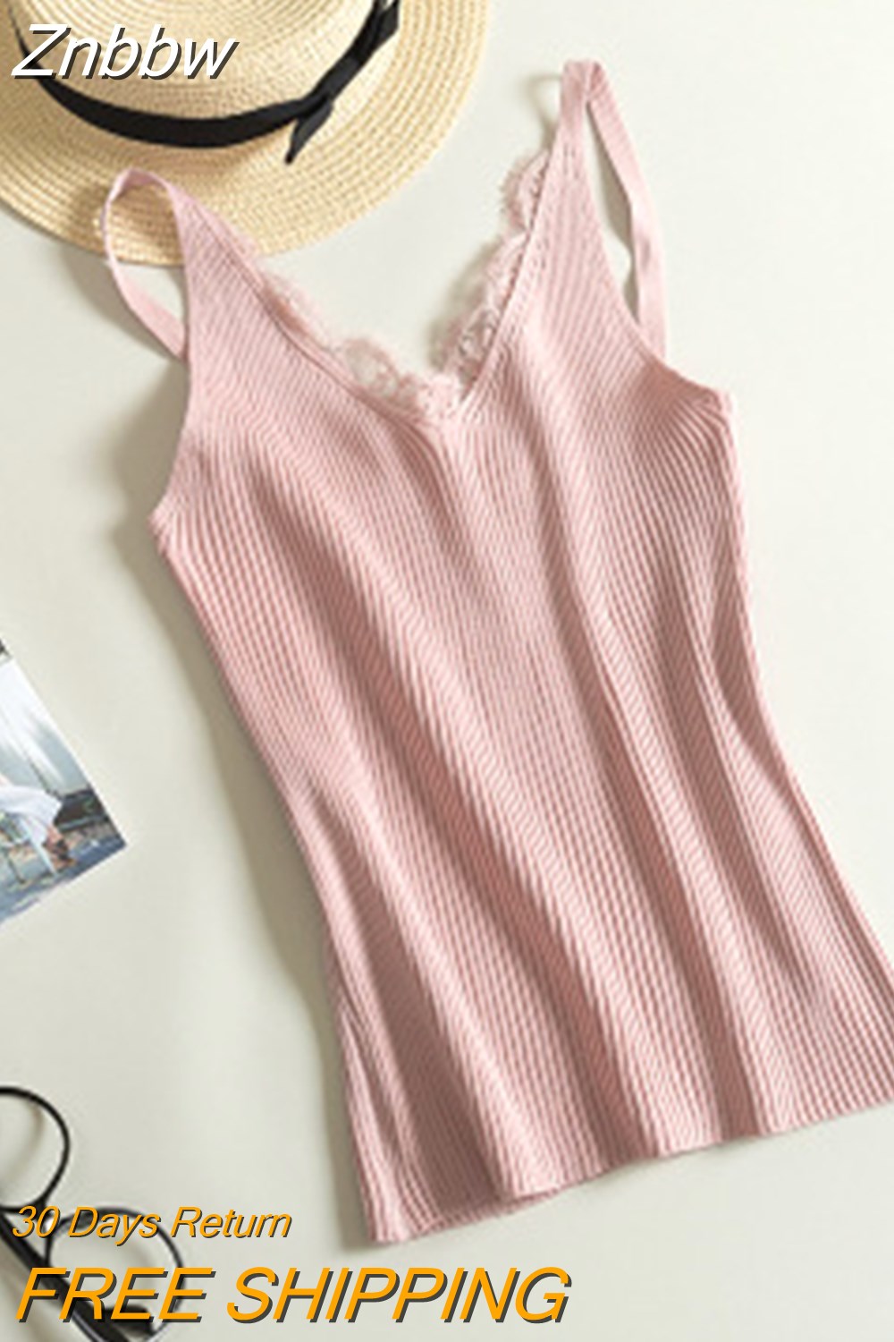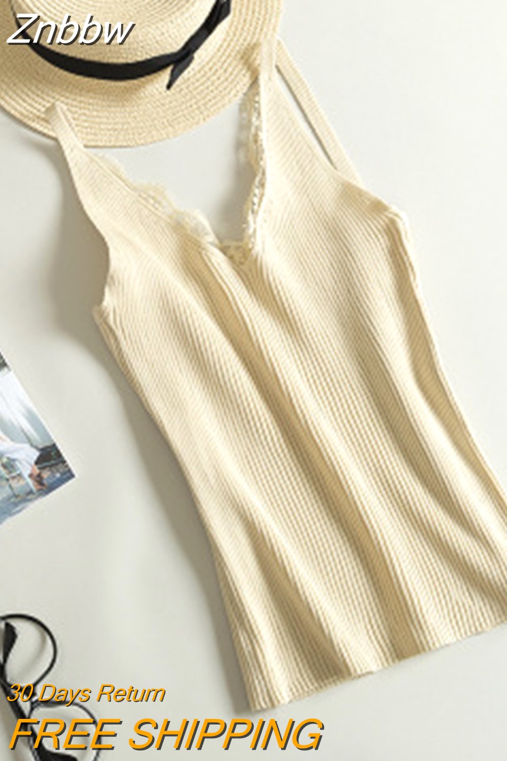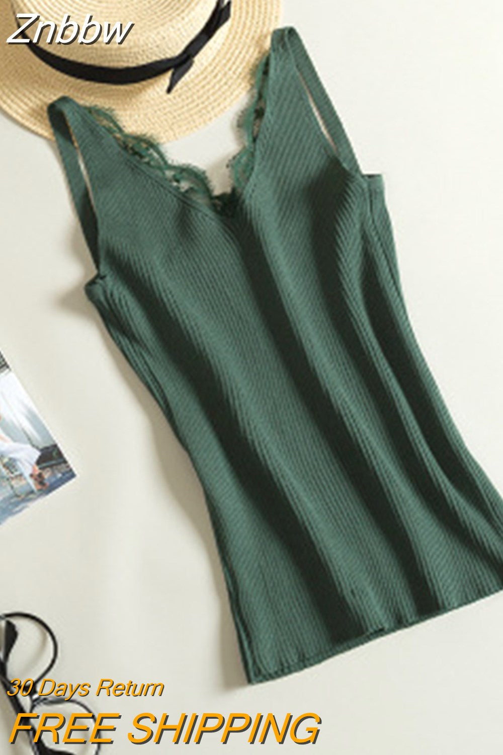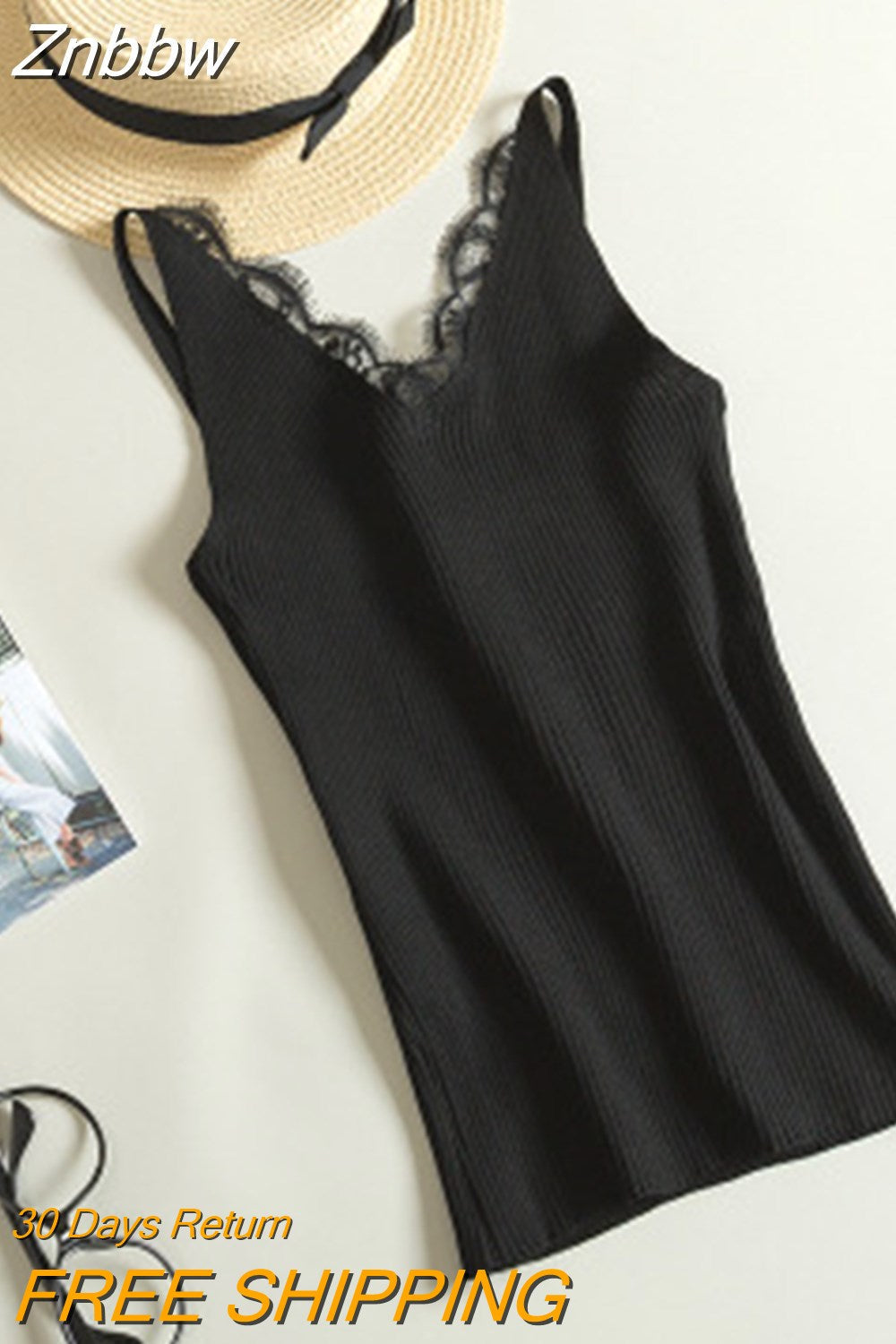Znbbw Spring New Hook Flower Lace Solid Stitching V-neck Camis Female Knitted Short Section Slim Outer Wear Shirt Trend Tank Tops