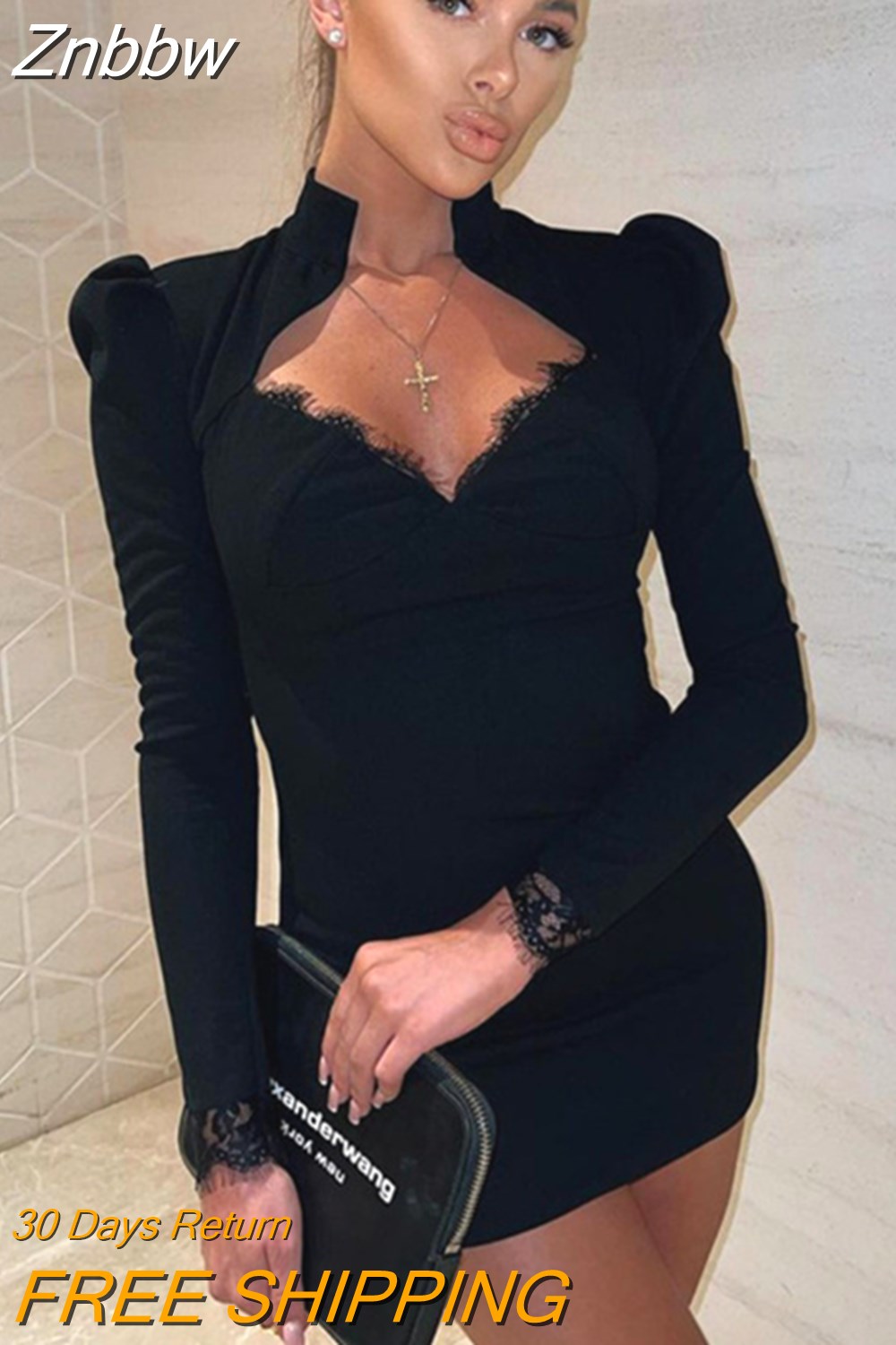 Znbbw Stand Collar Pleated Dress Women Sexy Elegant Bodycon Streewear Latern Sleeve Hollow Out Mini Dress Black Vestidos
