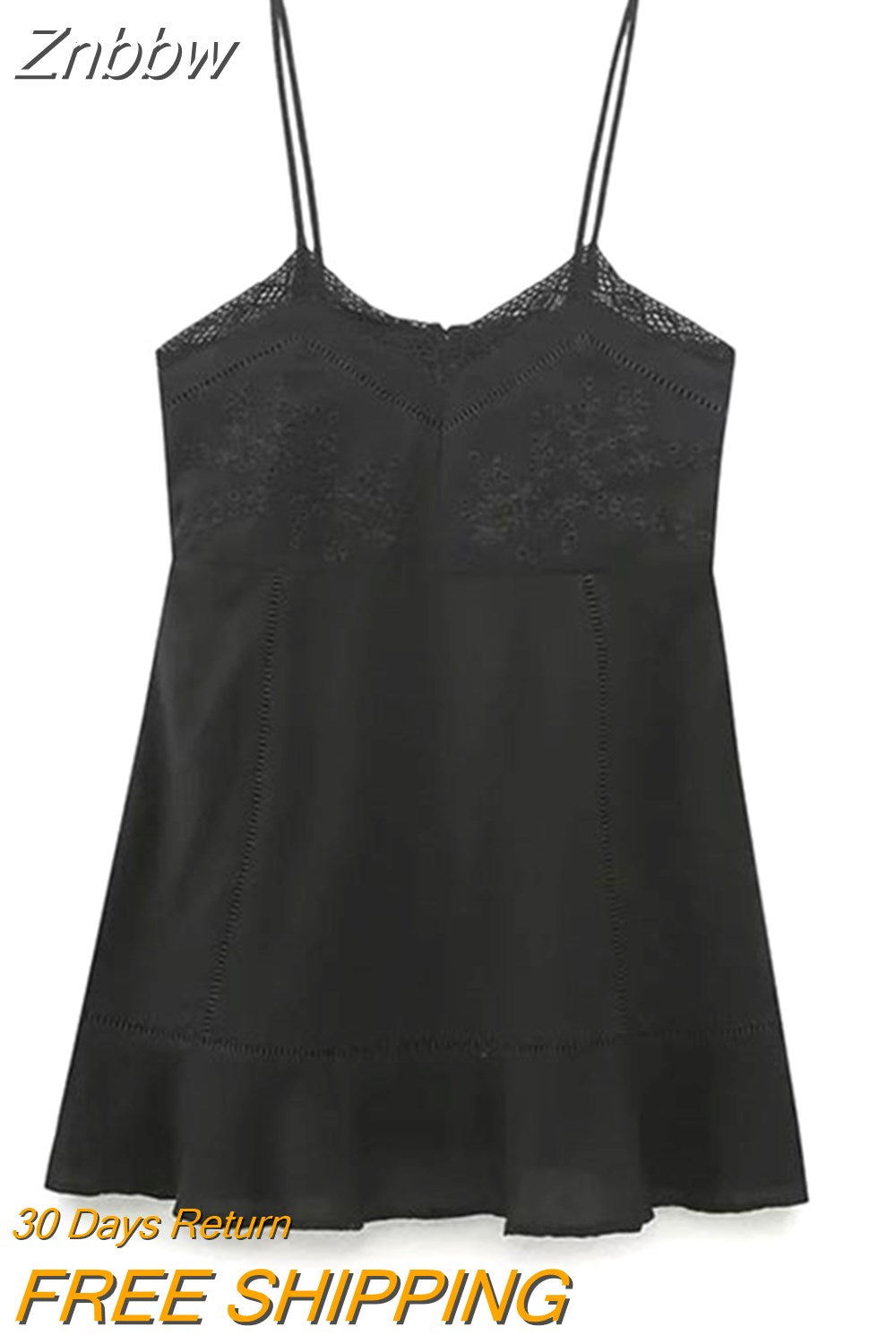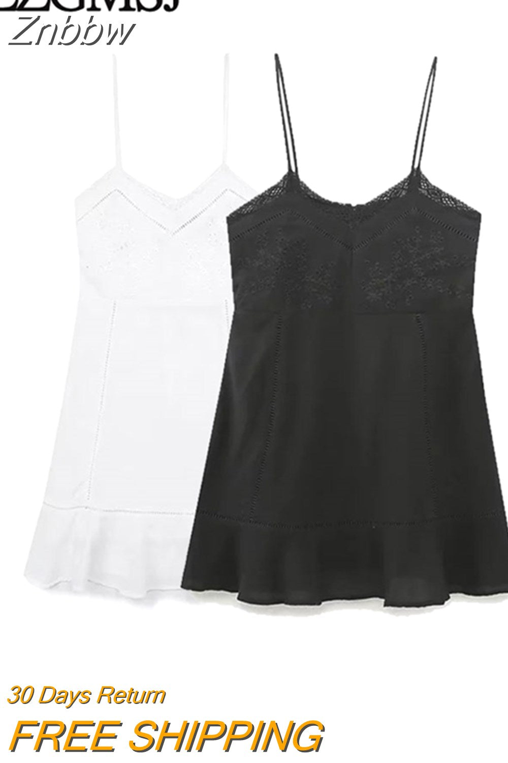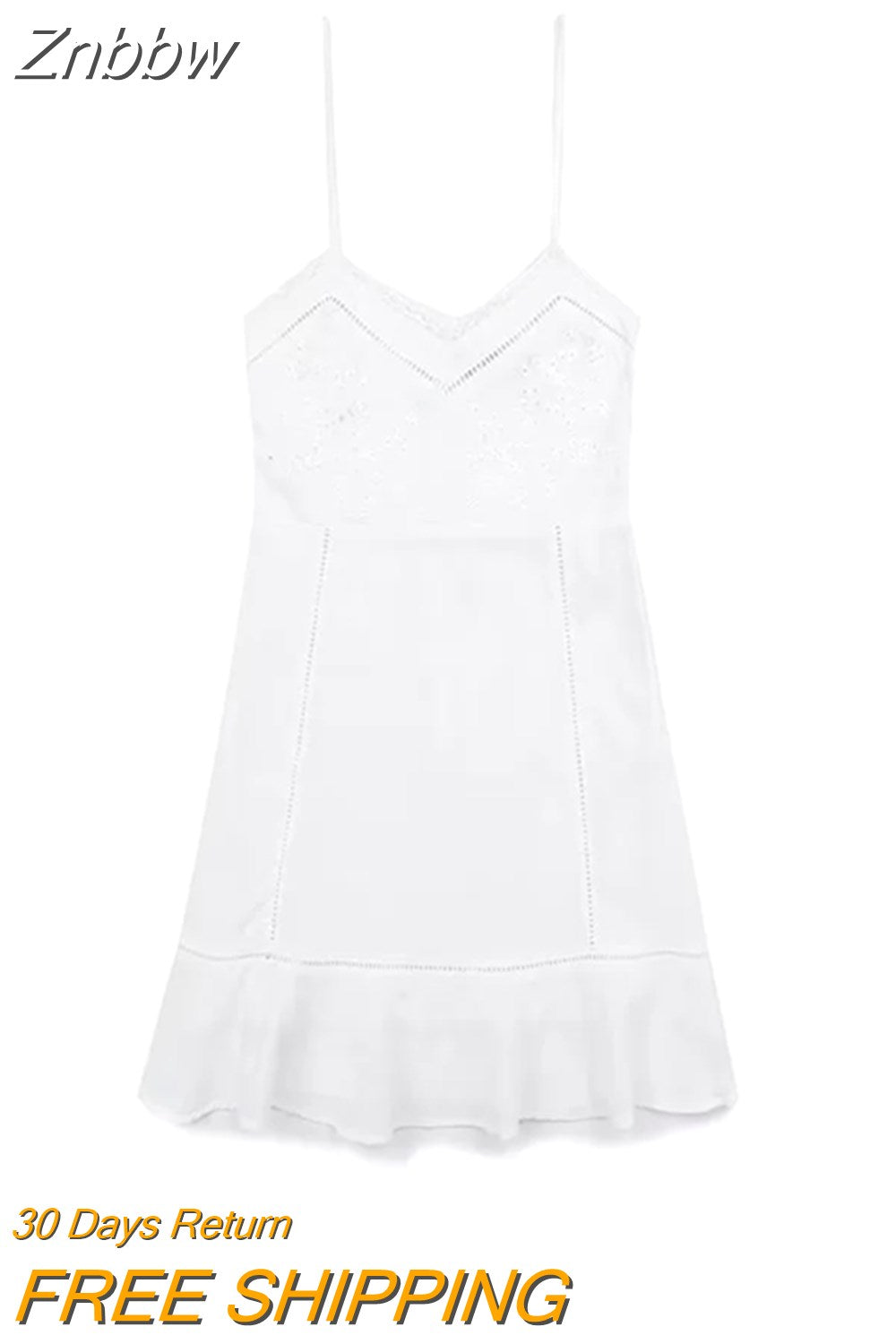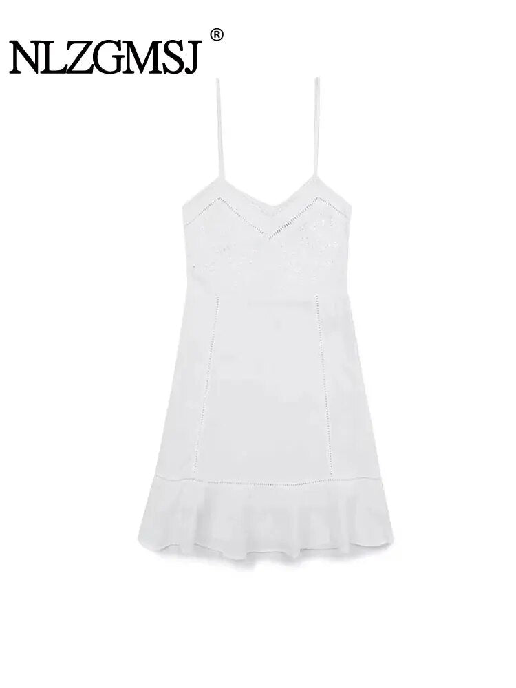 Znbbw TRAF Women 2023 Casual Pure Loose Fit Fashion Embroidery Hollow out Mini Vintage Strap Dress Vestidos Mujer