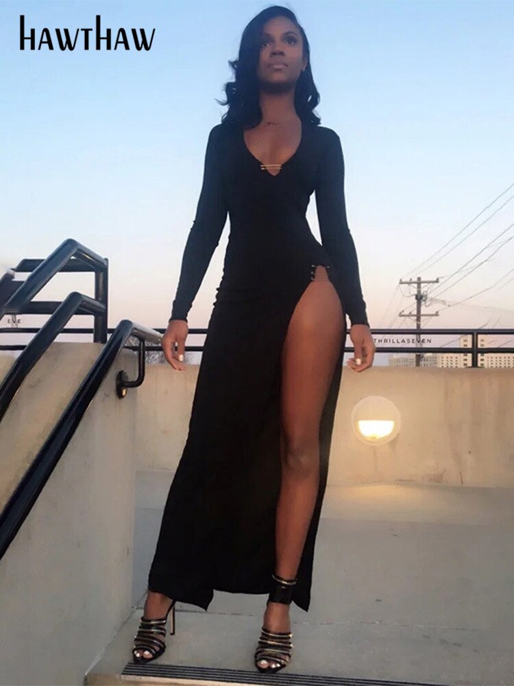Znbbw Women Autumn Winter V Neck Slim Long Sleeve Hollow Out Black Open Fork Split Long Dress 2023 Fall Clothes Streetwear