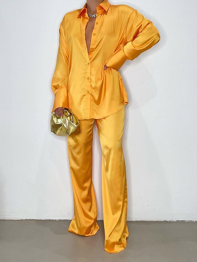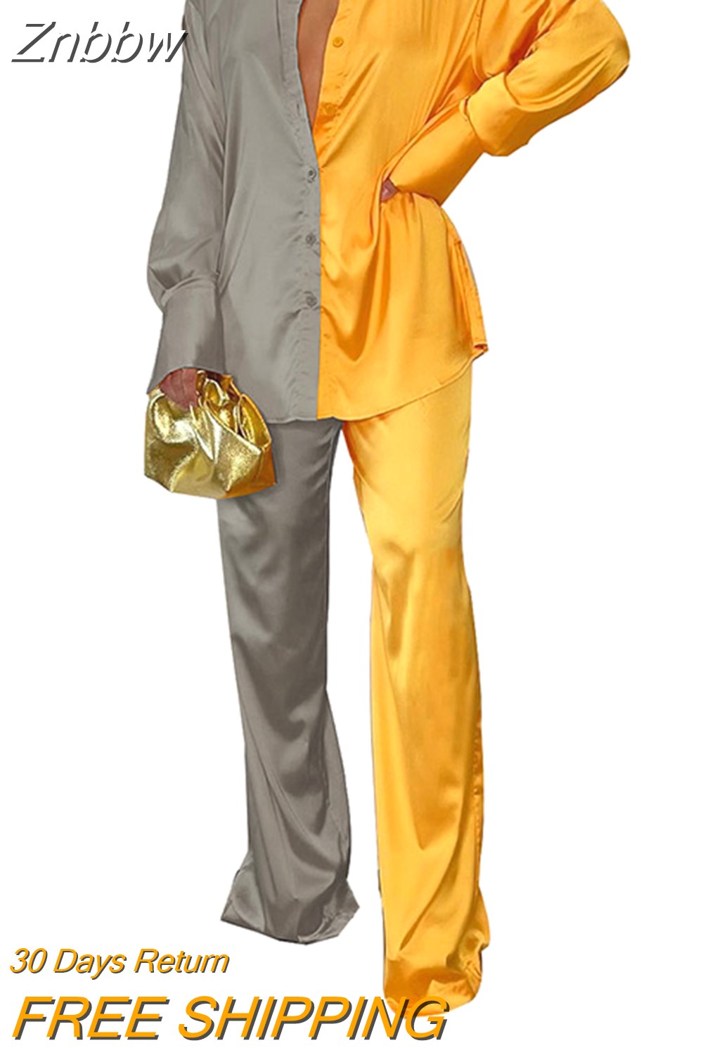 Znbbw Women Elegant Satin Two Piece Sets Casual Feamle Solid Loose Outfits Long Sleeve Shirt And Wide Leg Straight Pants Suits 2023