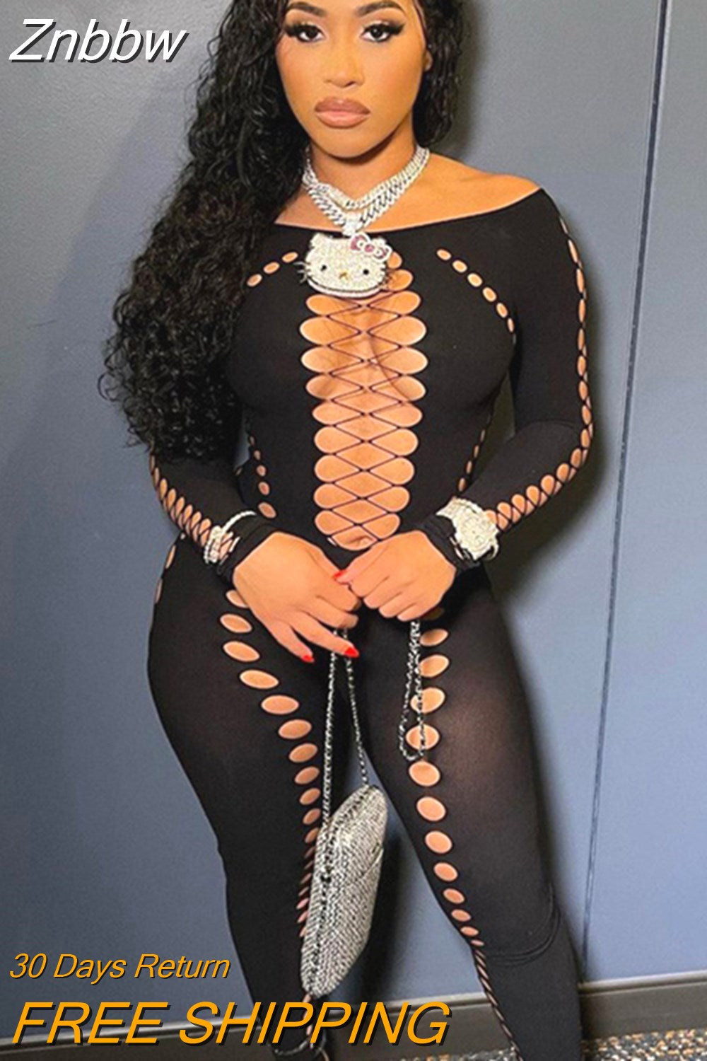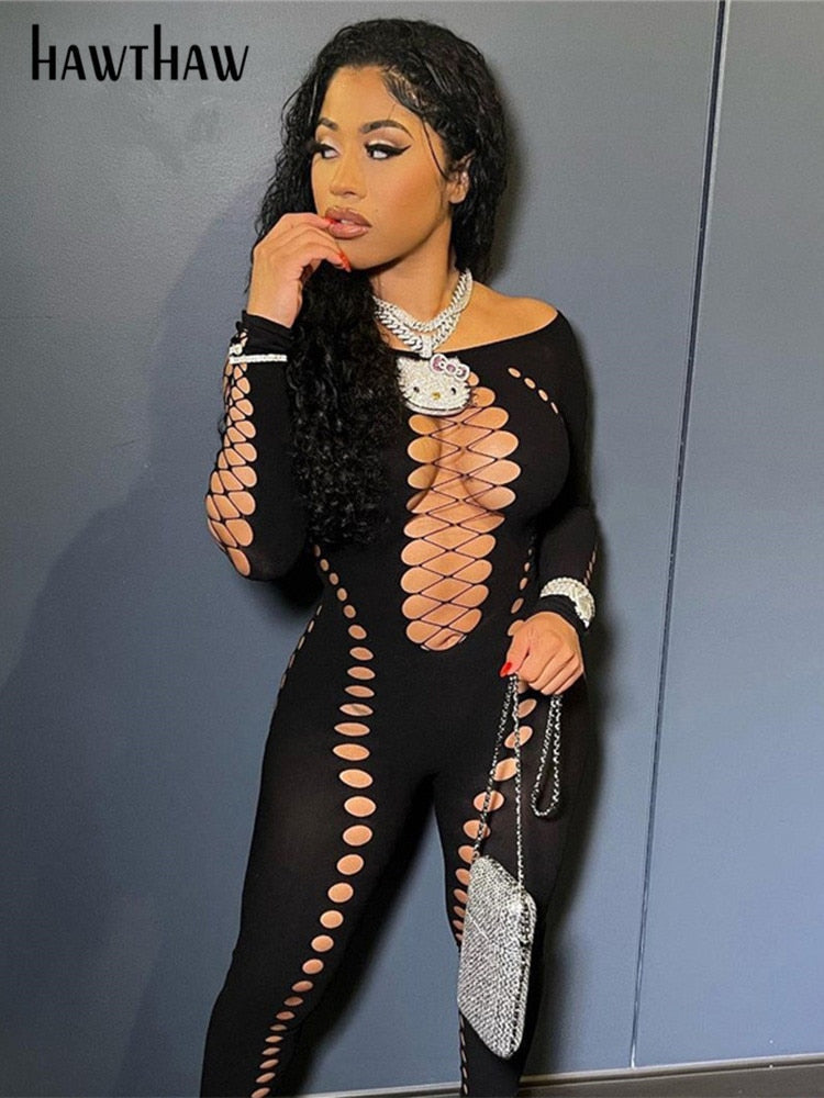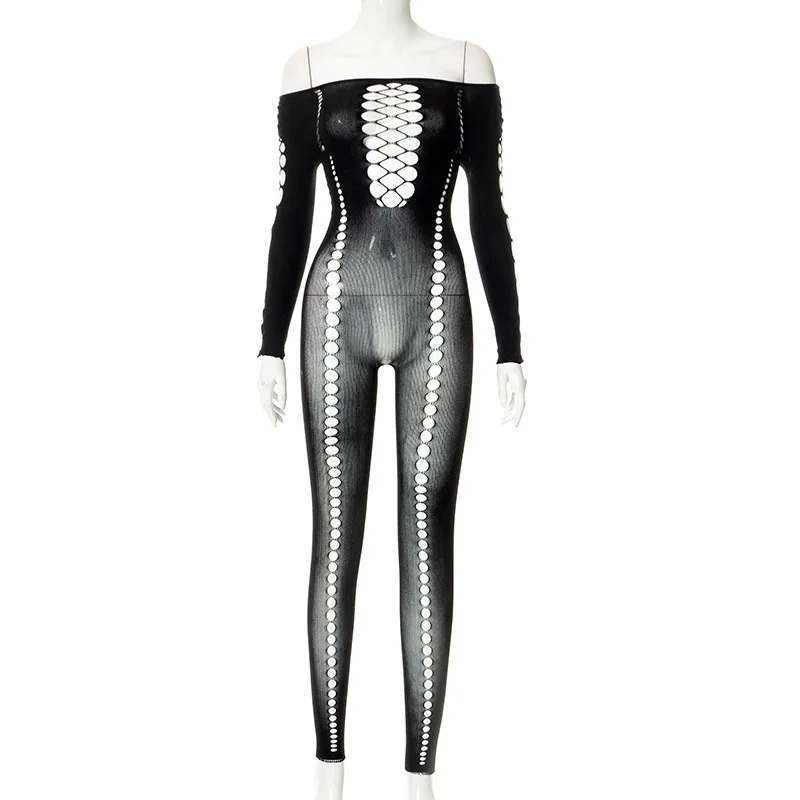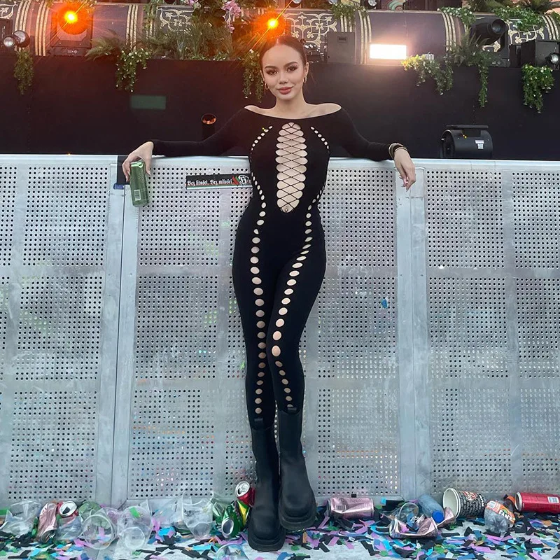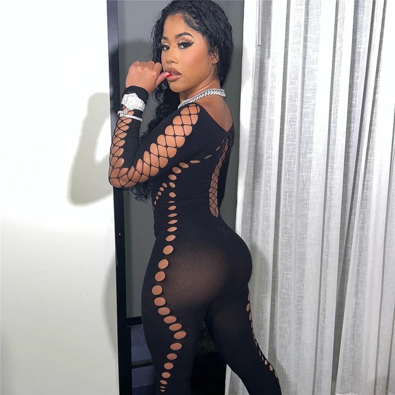 Znbbw Women Sexy Long Sleeve Hollow Out Bodycon Black Jumpsuit Overalls 2023 Fall Clothing Wholesale Items For Business