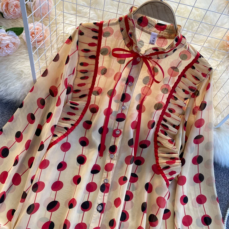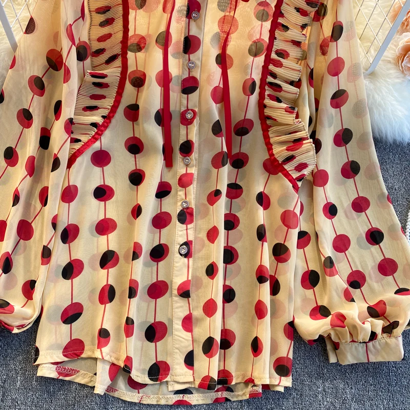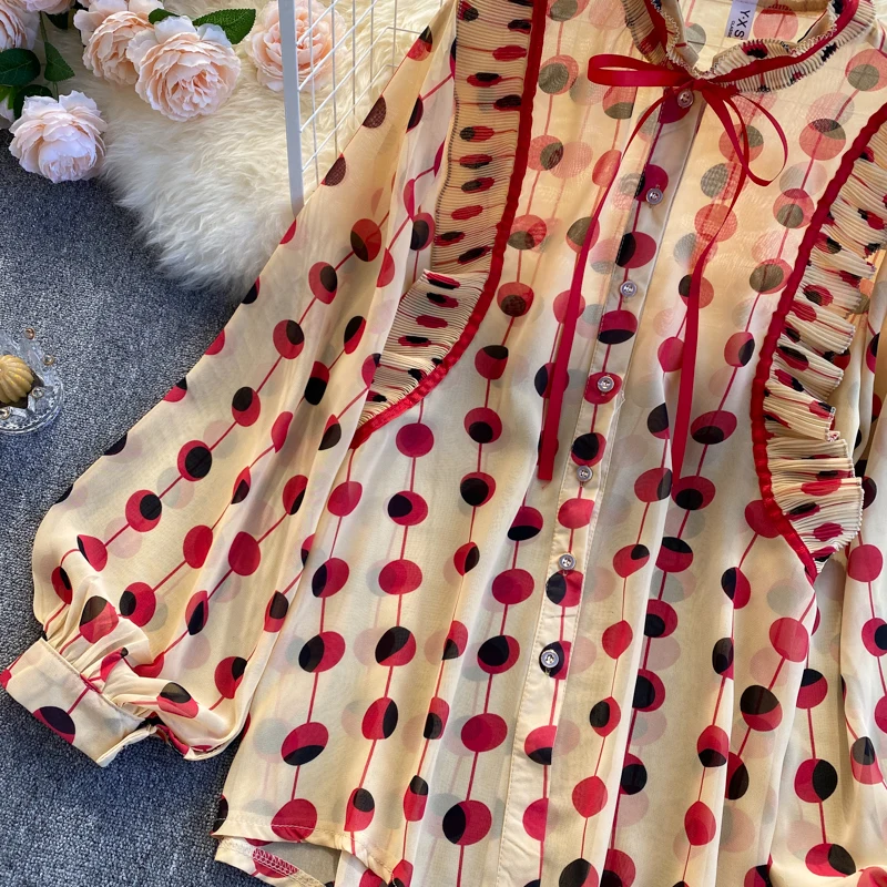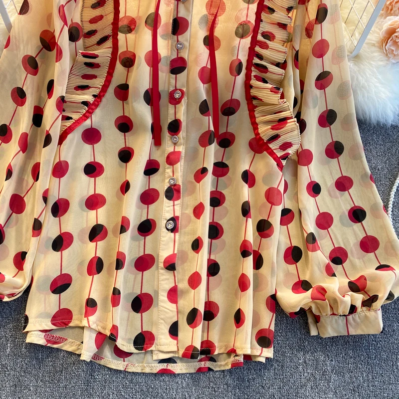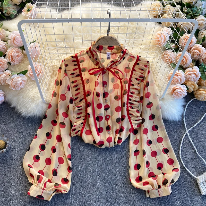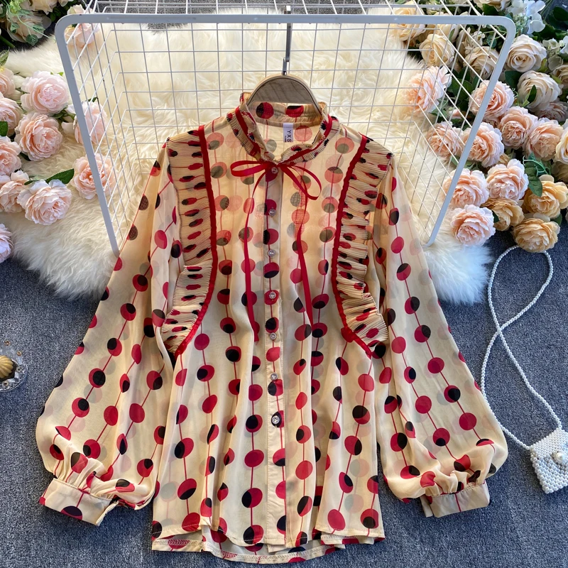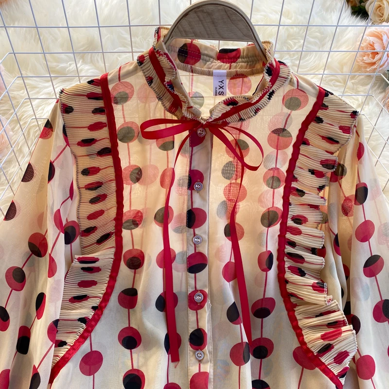 Znbbw Autumn Chiffon Blouse Female Pleated Wood Ear Slim Puff Sleeve Stand Collar Blusa Color Matching Polka Dot Shirt C433