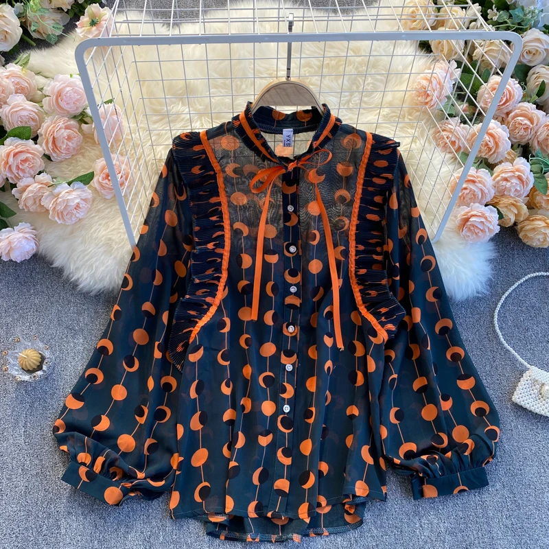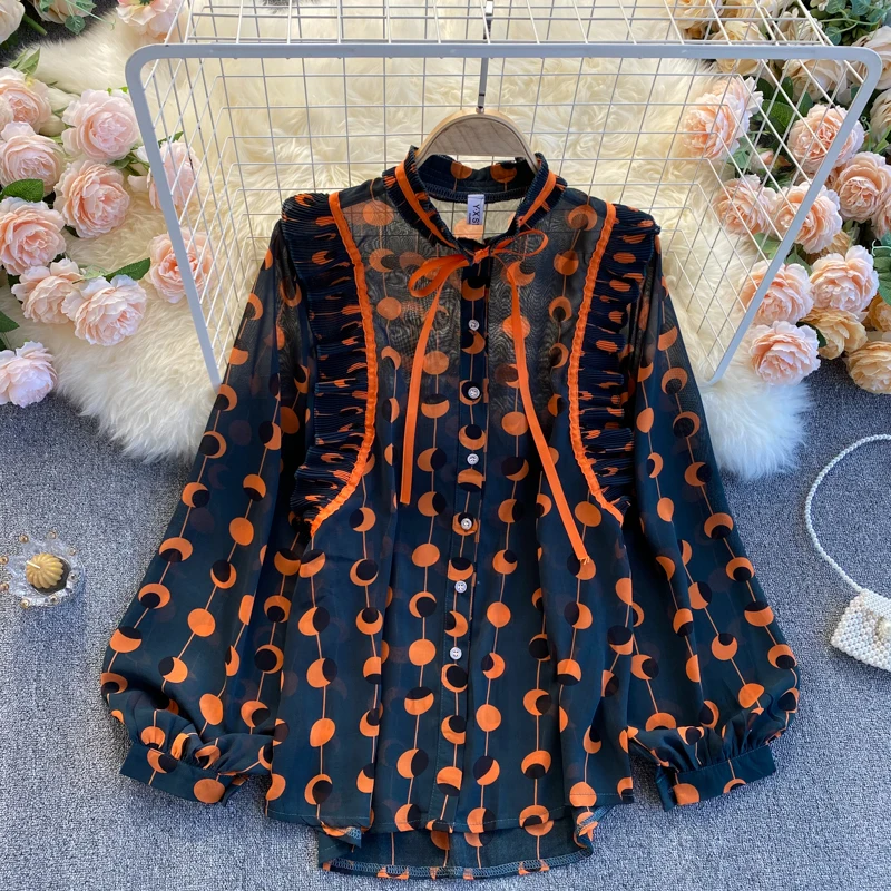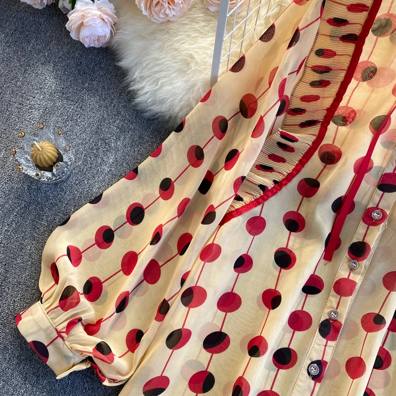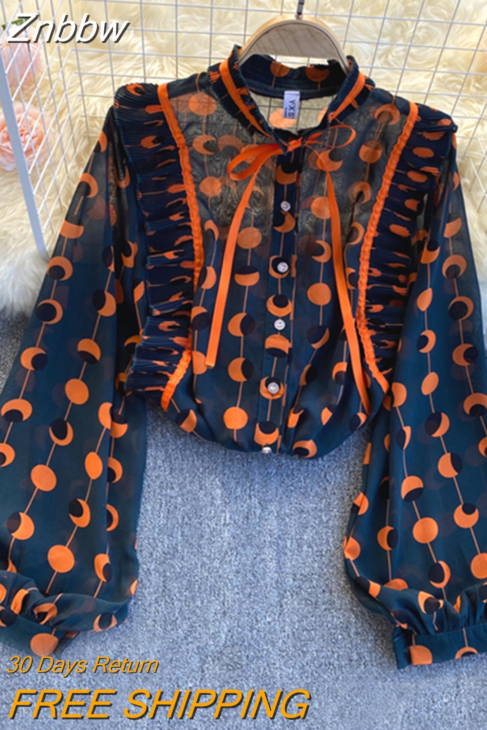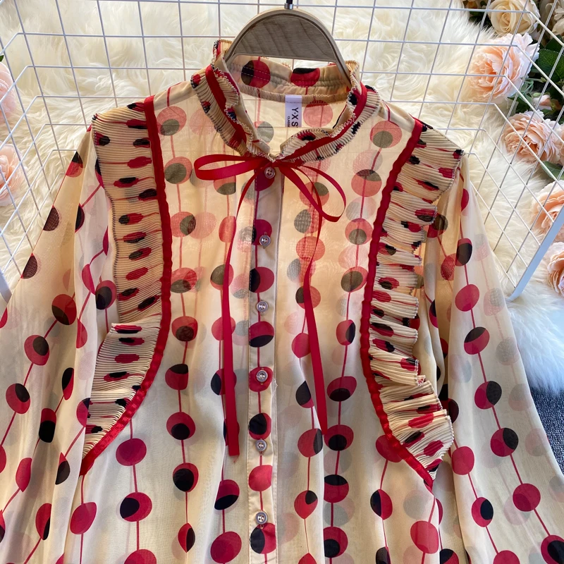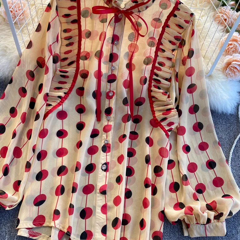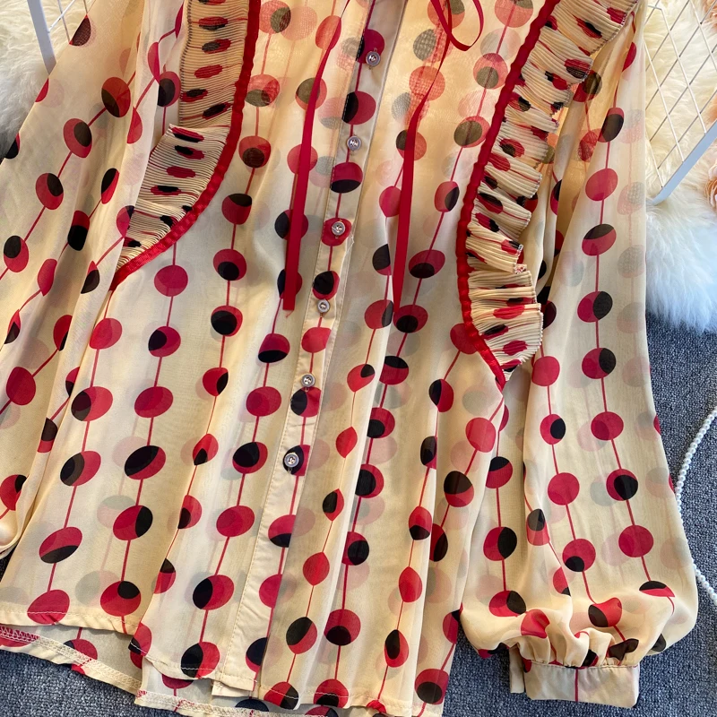Znbbw Autumn Chiffon Blouse Female Pleated Wood Ear Slim Puff Sleeve Stand Collar Blusa Color Matching Polka Dot Shirt C433