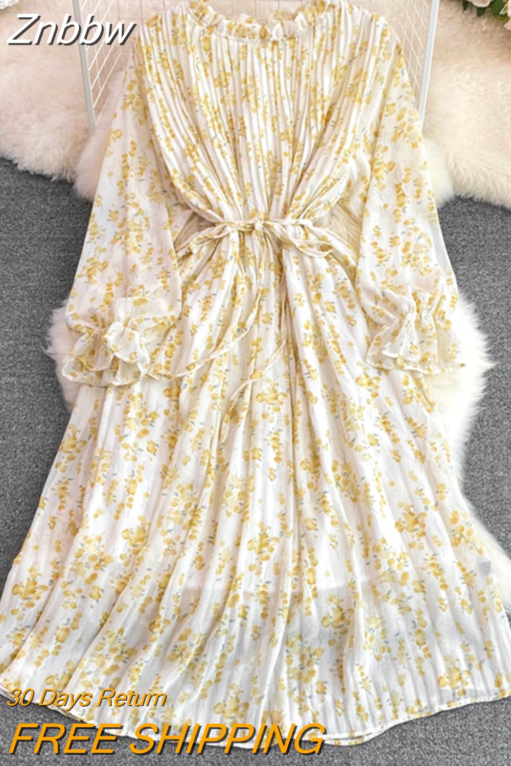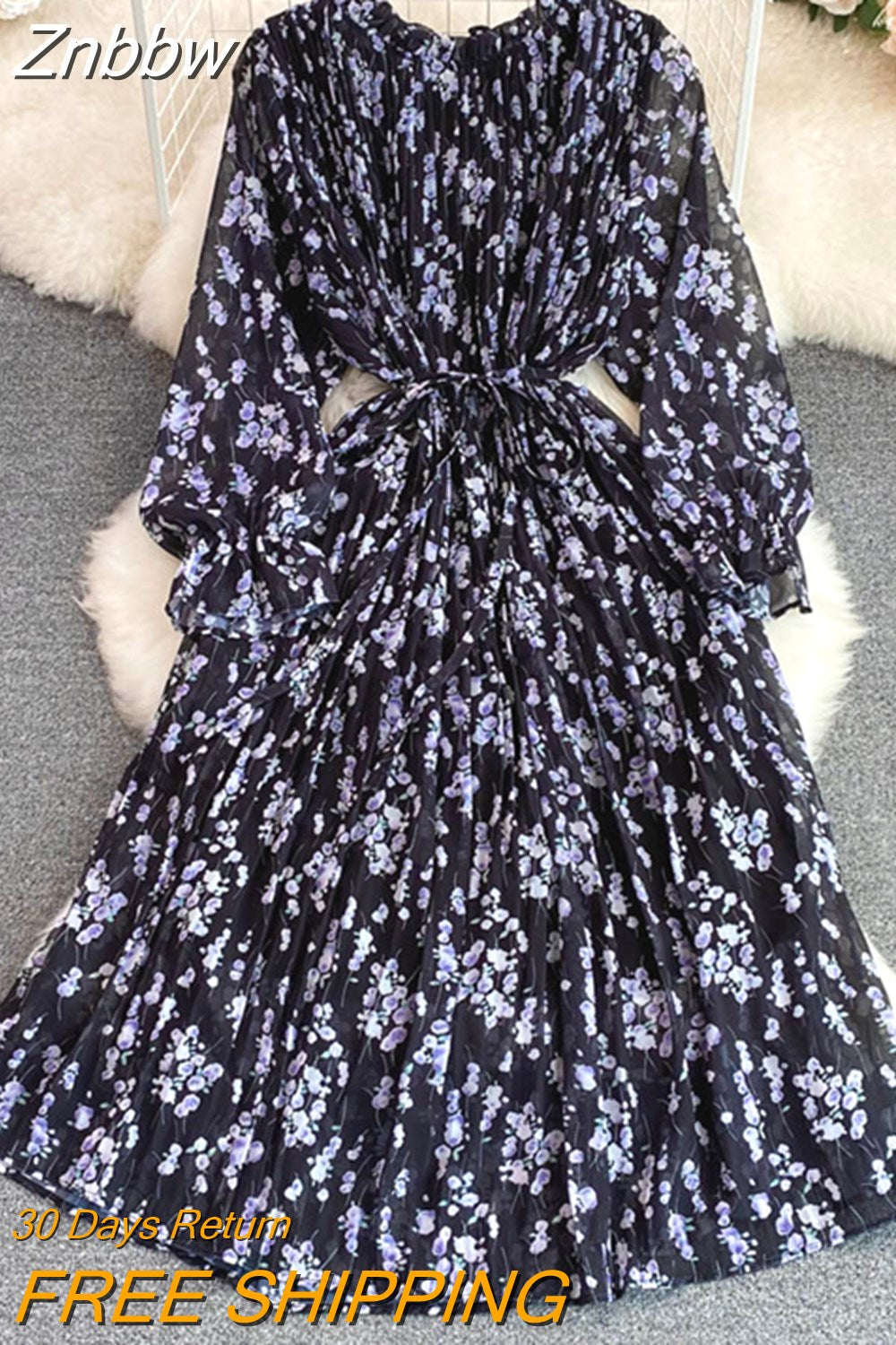 Znbbw Autumn Floral Gentle Fairy Dress Short Round Neck Bubble Long Sleeve Pleated Waist Thin A-line Vestidos Women D1441