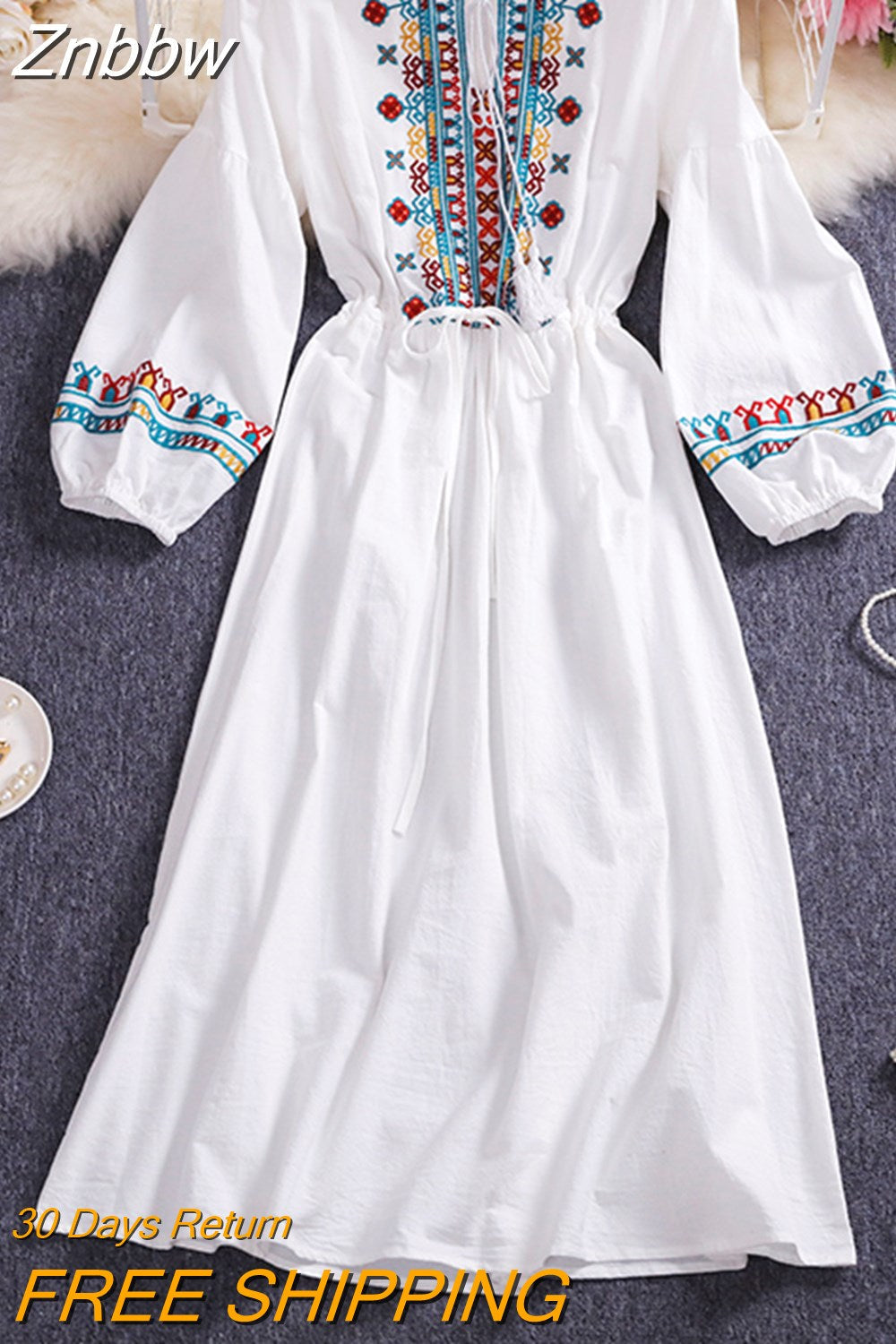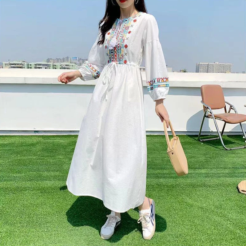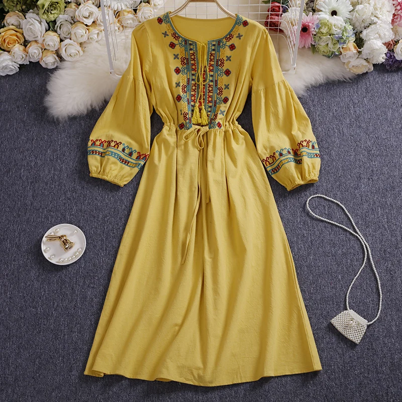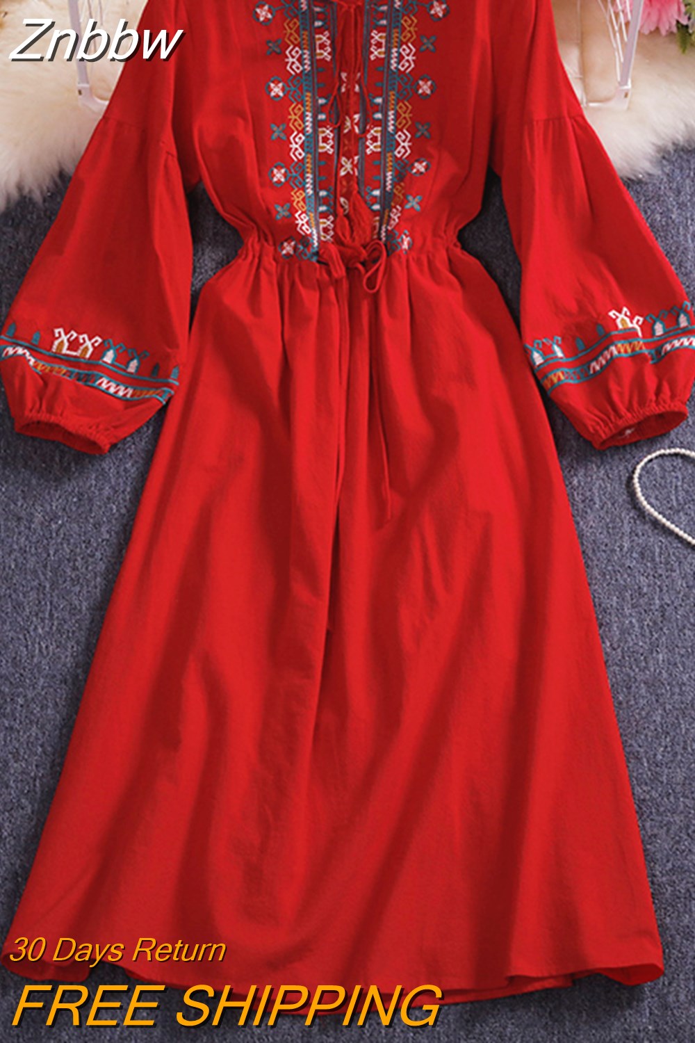 Znbbw Autumn Women Dresses Bohemian Embroidered Flower O-Neck Lantern Sleeve High Waist Dress All-match Female Vestidos GD629