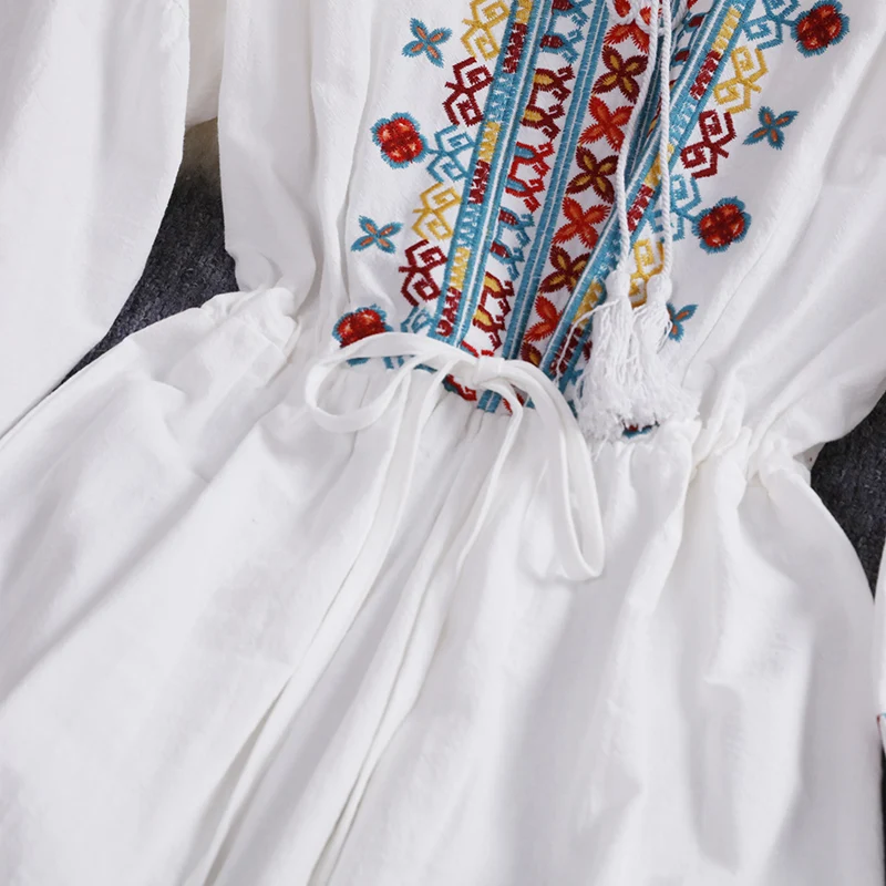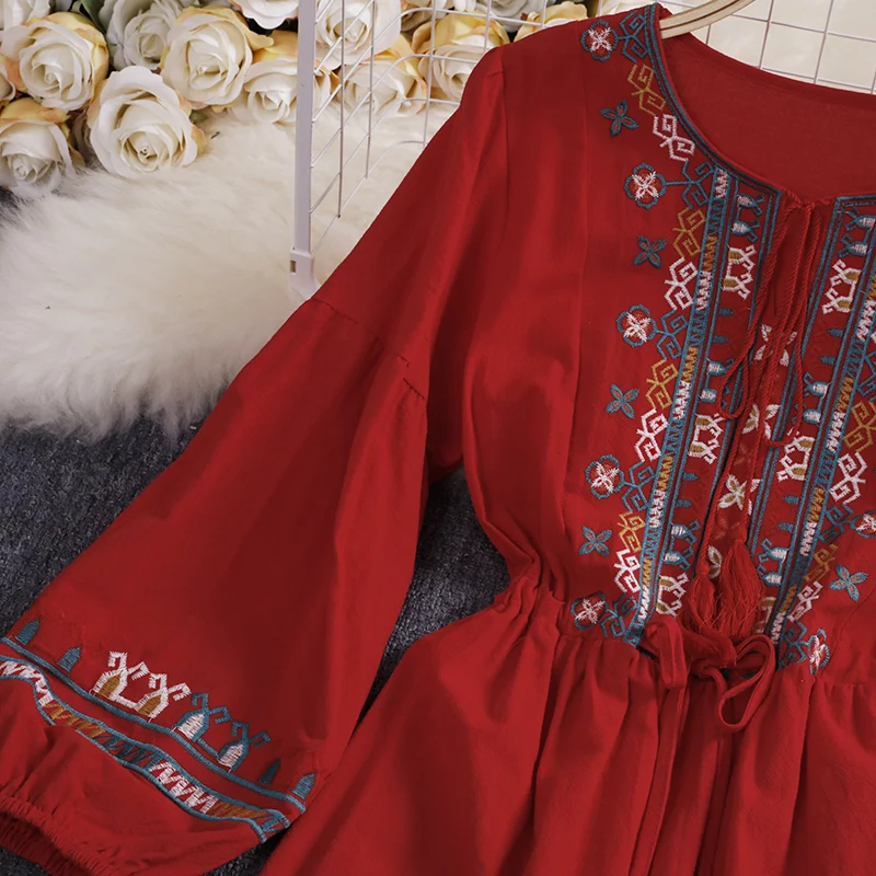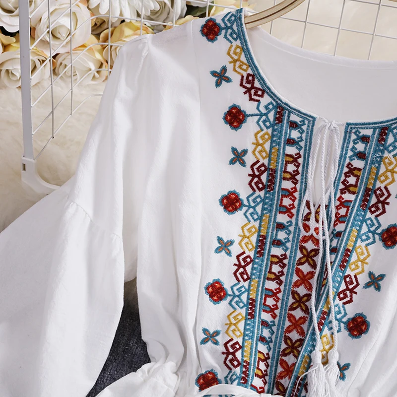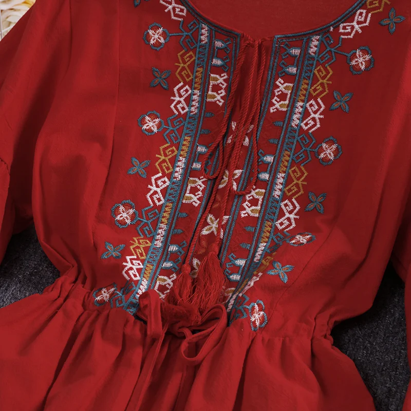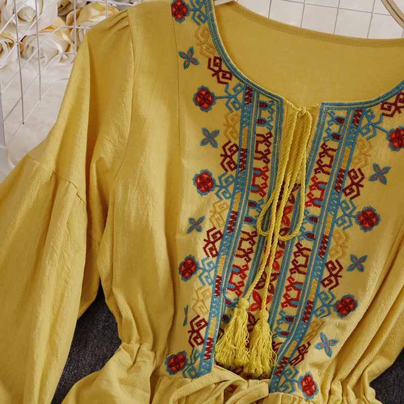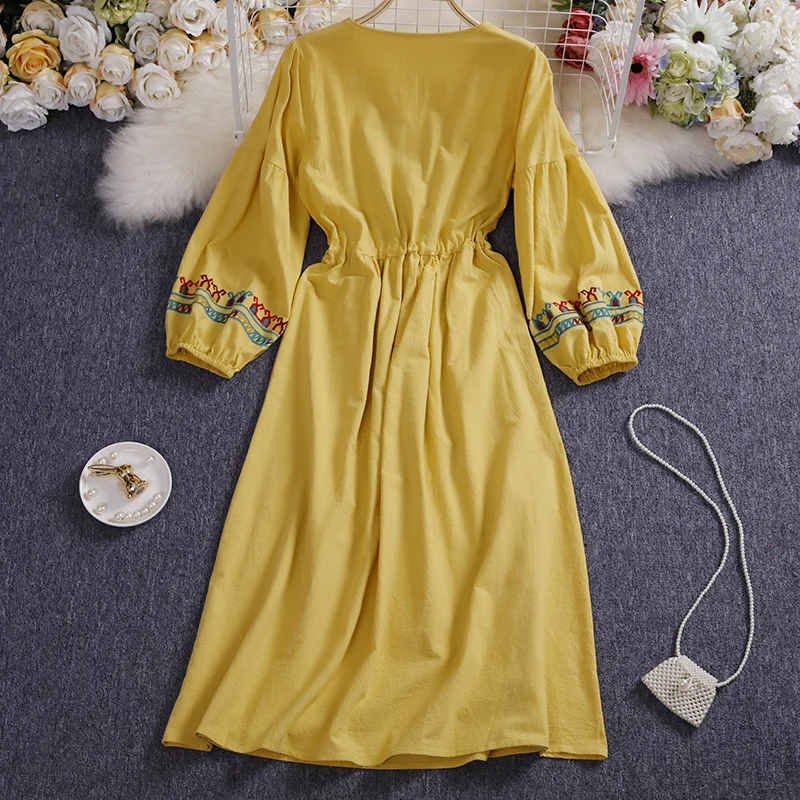 Znbbw Autumn Women Dresses Bohemian Embroidered Flower O-Neck Lantern Sleeve High Waist Dress All-match Female Vestidos GD629