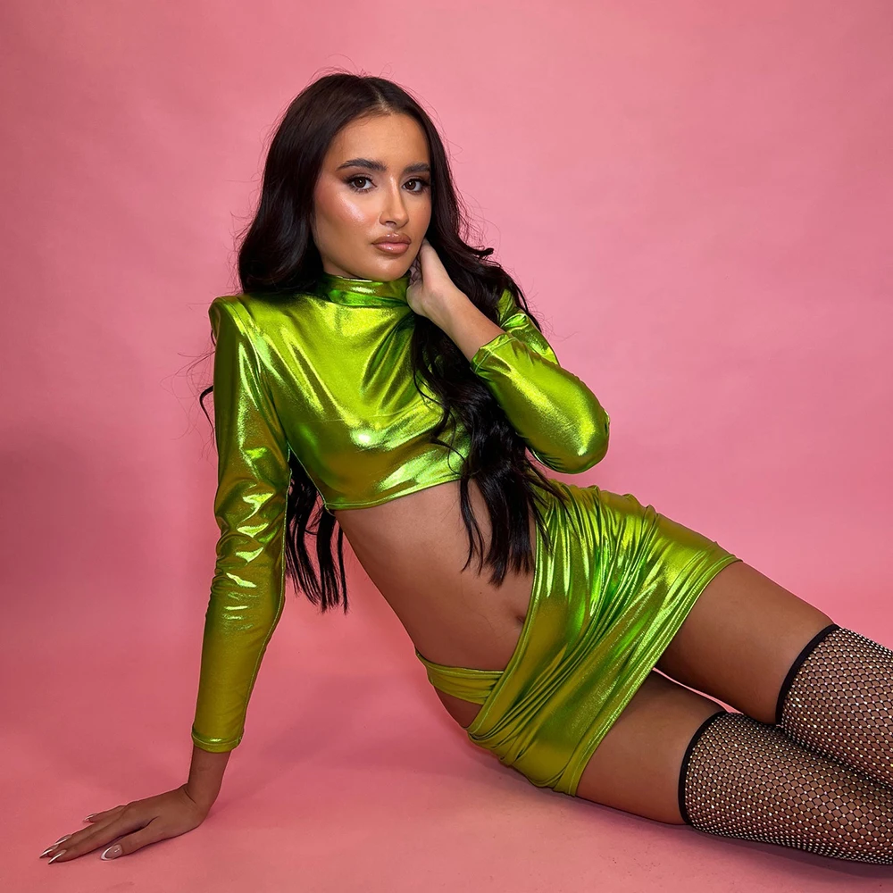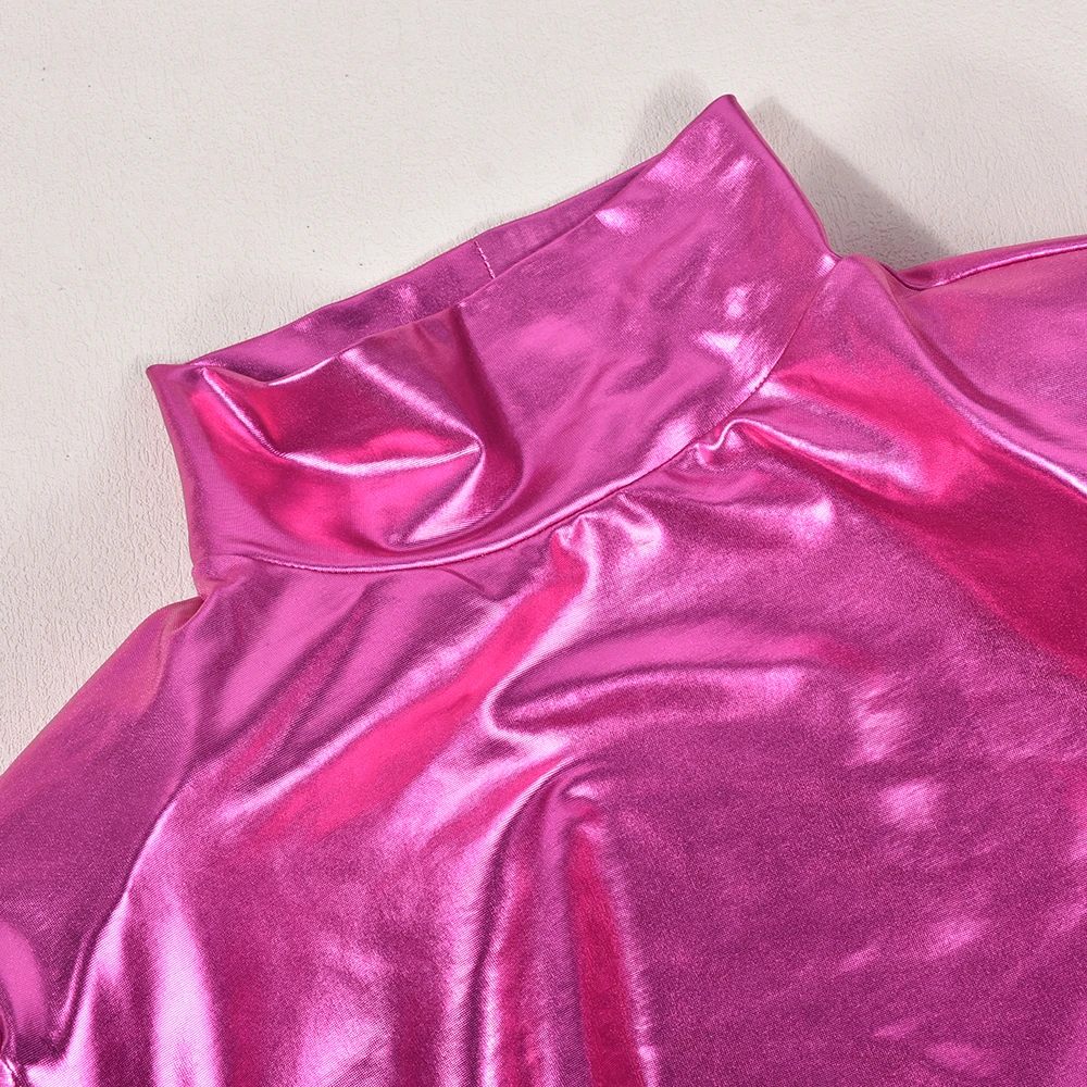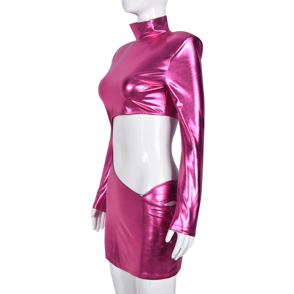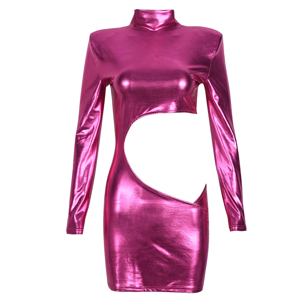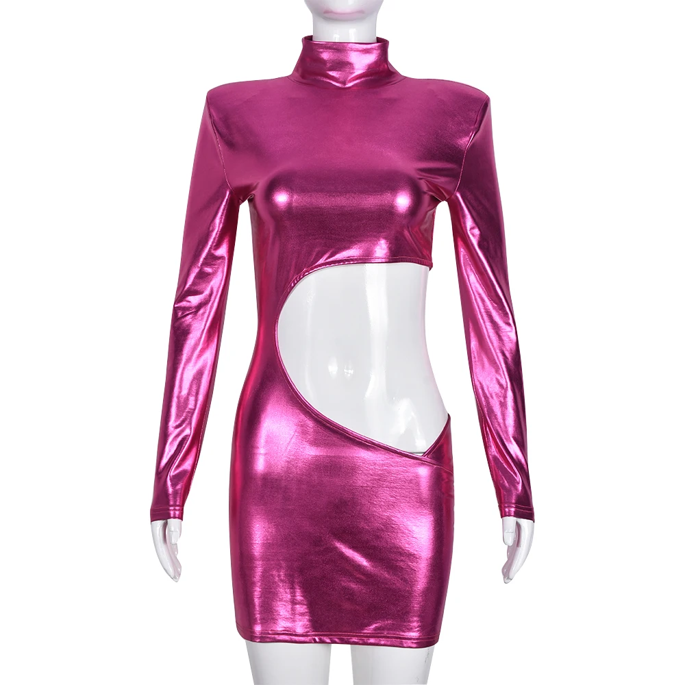 Znbbw Metallic Shiny Cut Out Bodycon Mini Dress Women Turtleneck Long Sleeve Slim Short Sundress 2023 Spring Fall Night Prom Robe