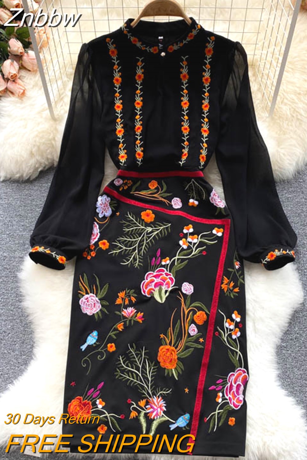 Znbbw New Autumn Fashion Vestidos Women's Temperament Small Stand-up Collar Retro Embroidered Midi Dress DK1062