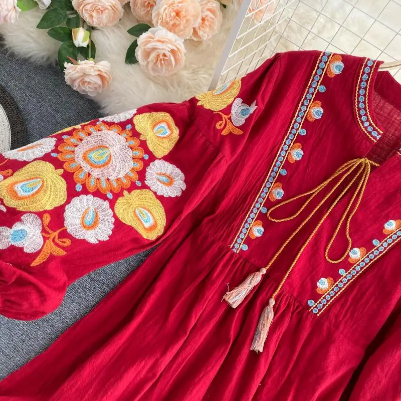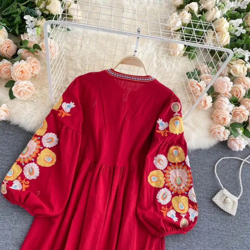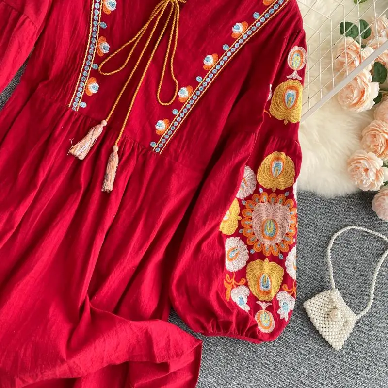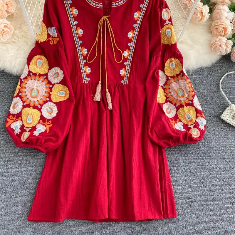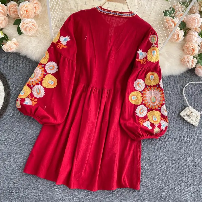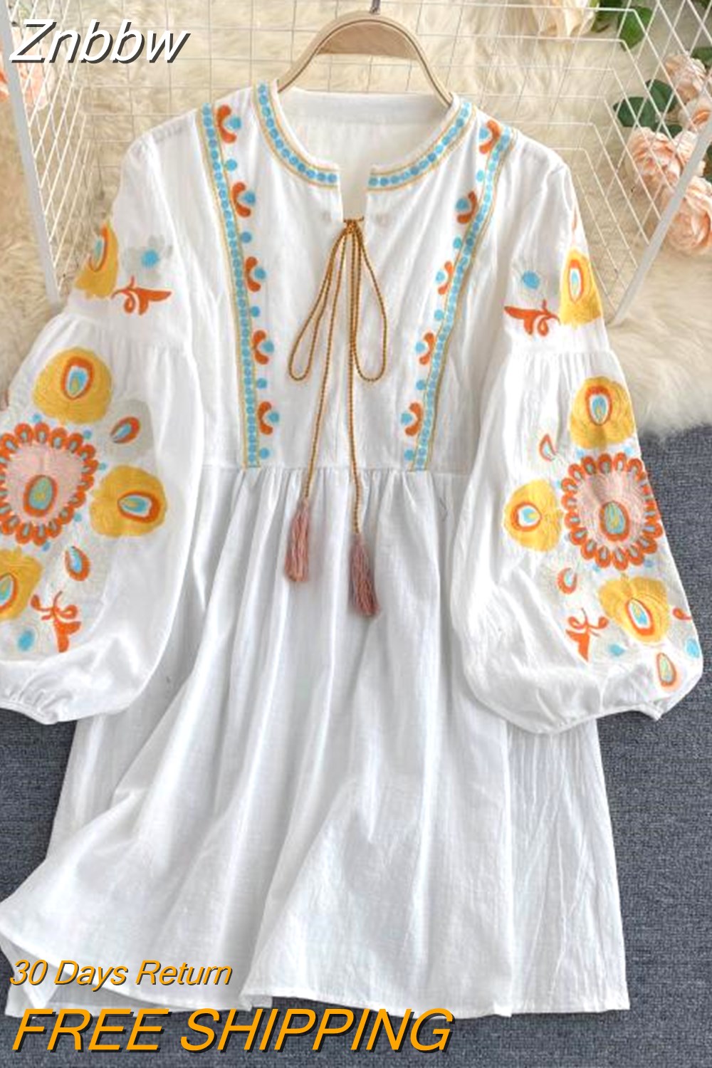 Znbbw New Bohemian Retro Folk Style Vestidos Female Heavy Industry Embroidery Round Neck Puff Sleeve Loose Mini Dress GL120