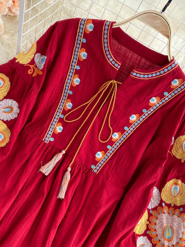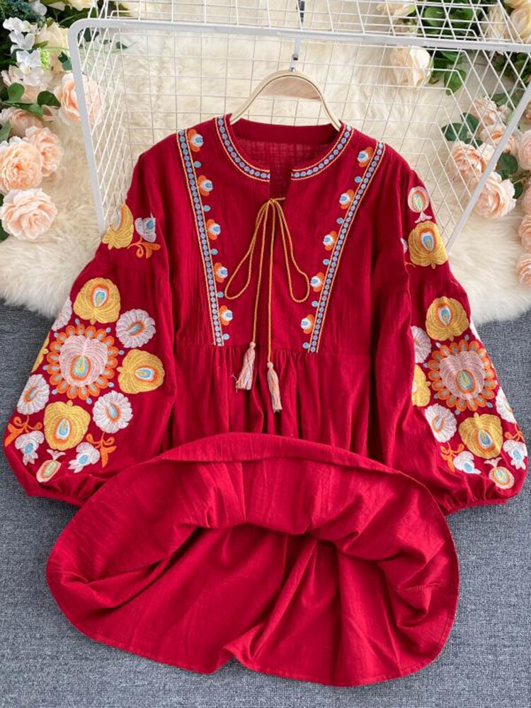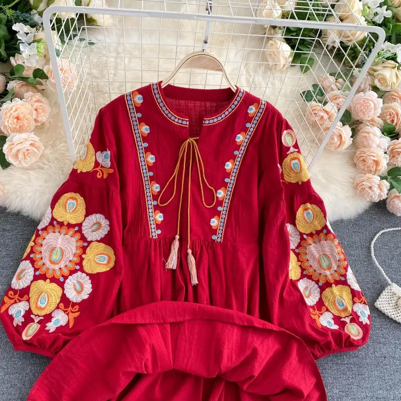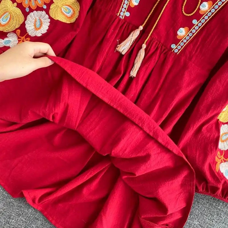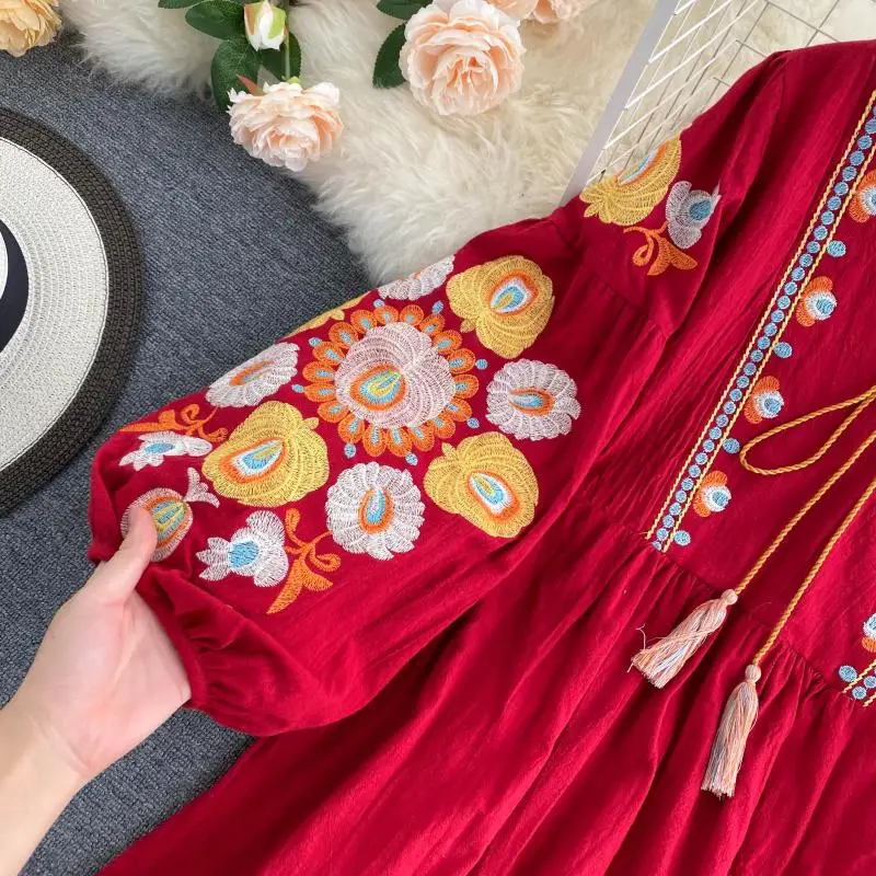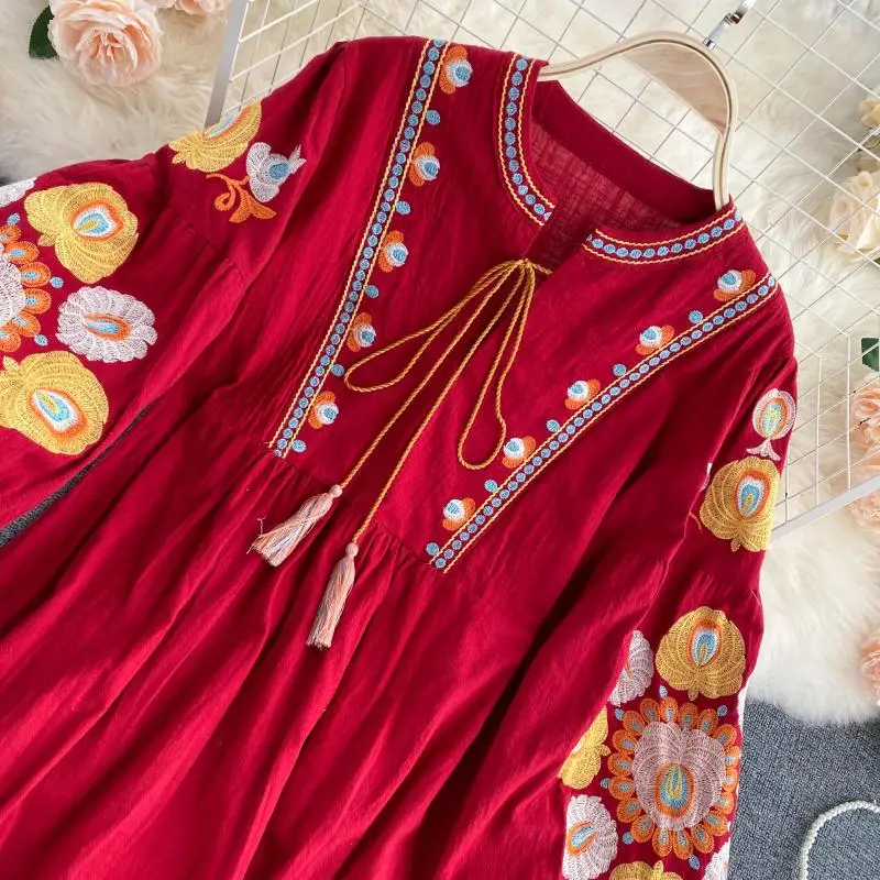 Znbbw New Bohemian Retro Folk Style Vestidos Female Heavy Industry Embroidery Round Neck Puff Sleeve Loose Mini Dress GL120