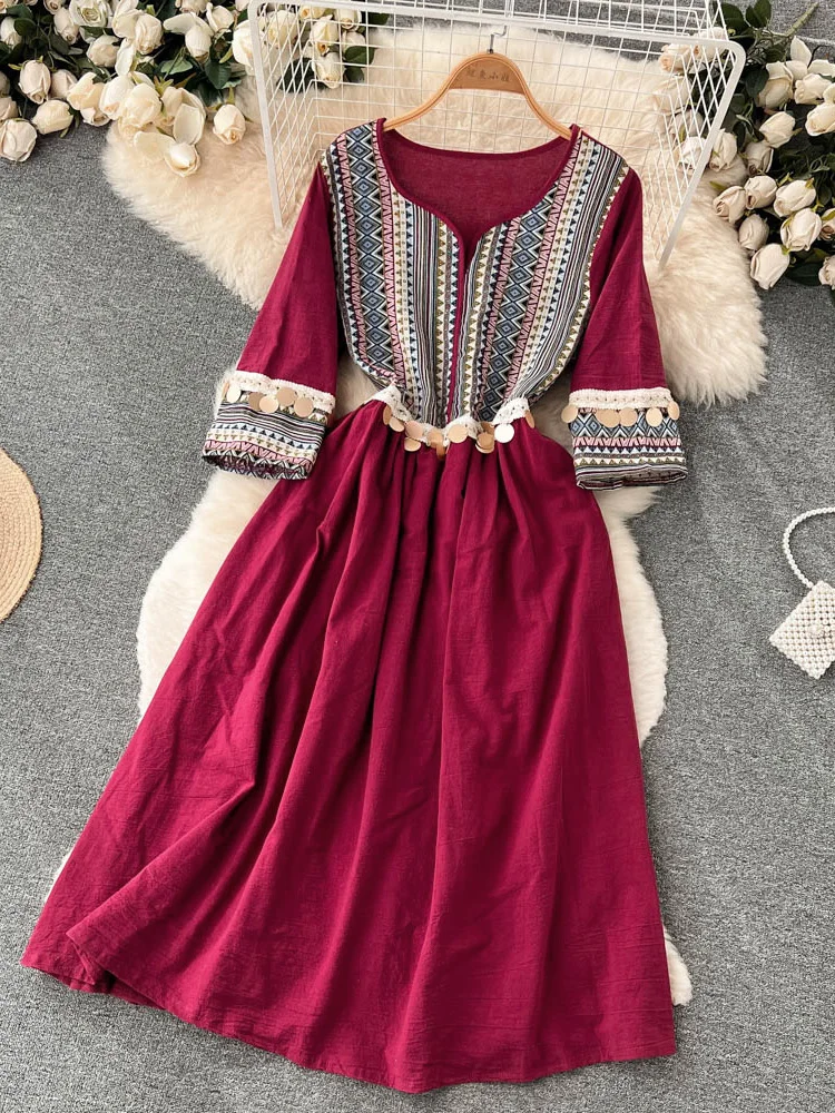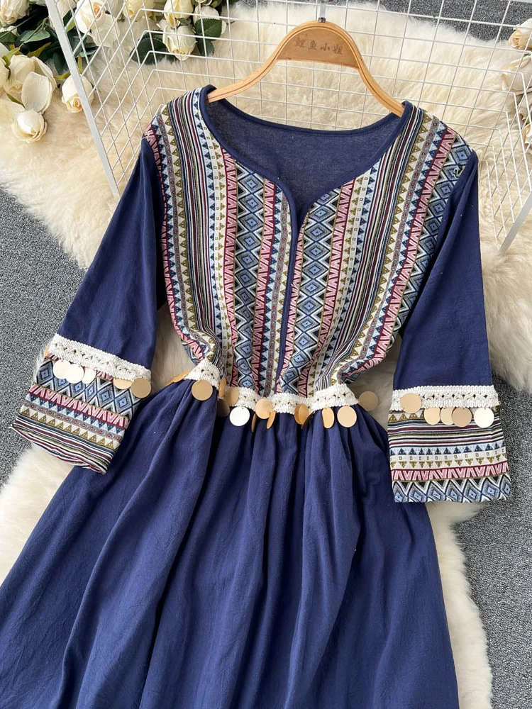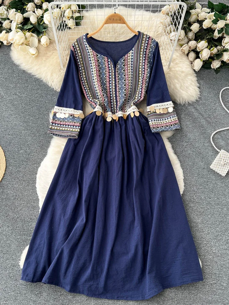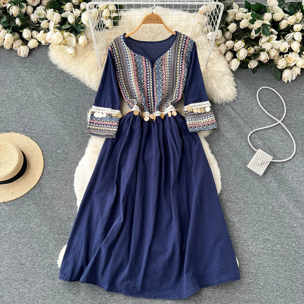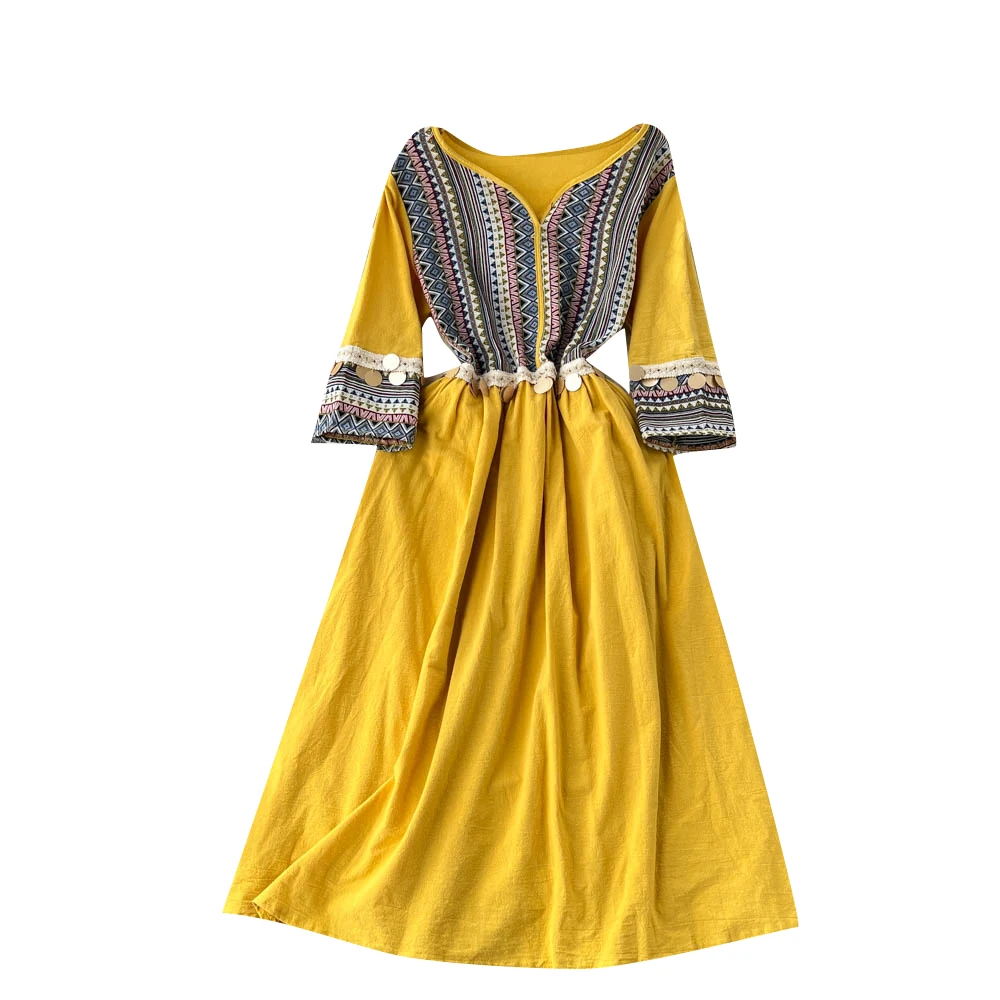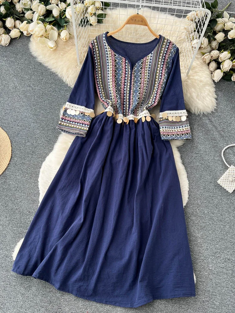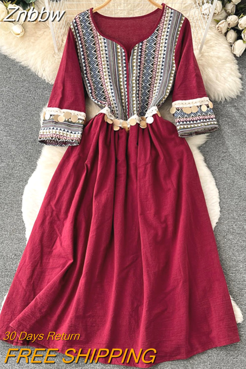 Znbbw Summer High-end Sense of Cold Wind Waist Thin Printed Long-sleeved Female Dress Beautiful V-neck Long Dress Women D1490