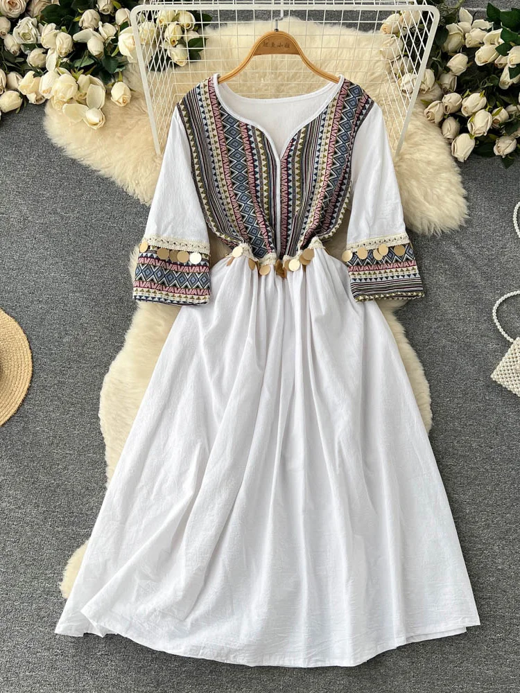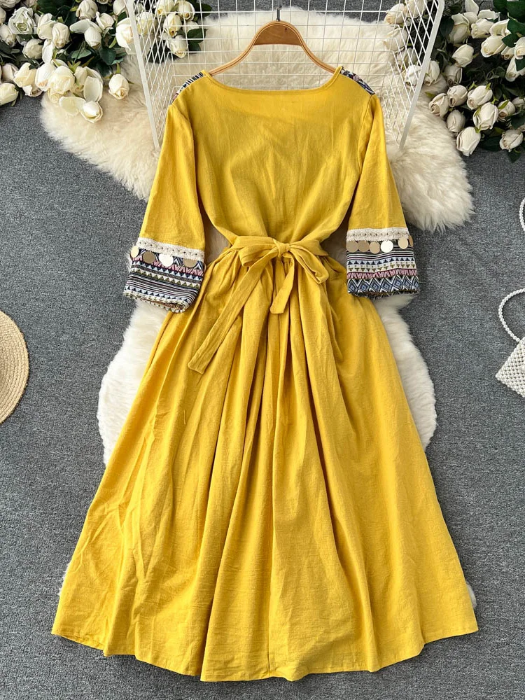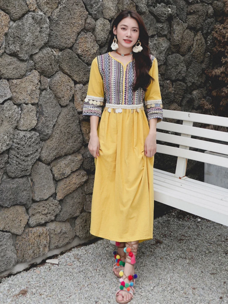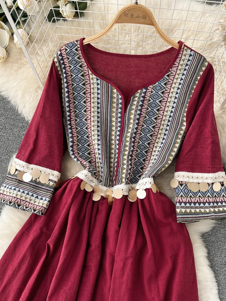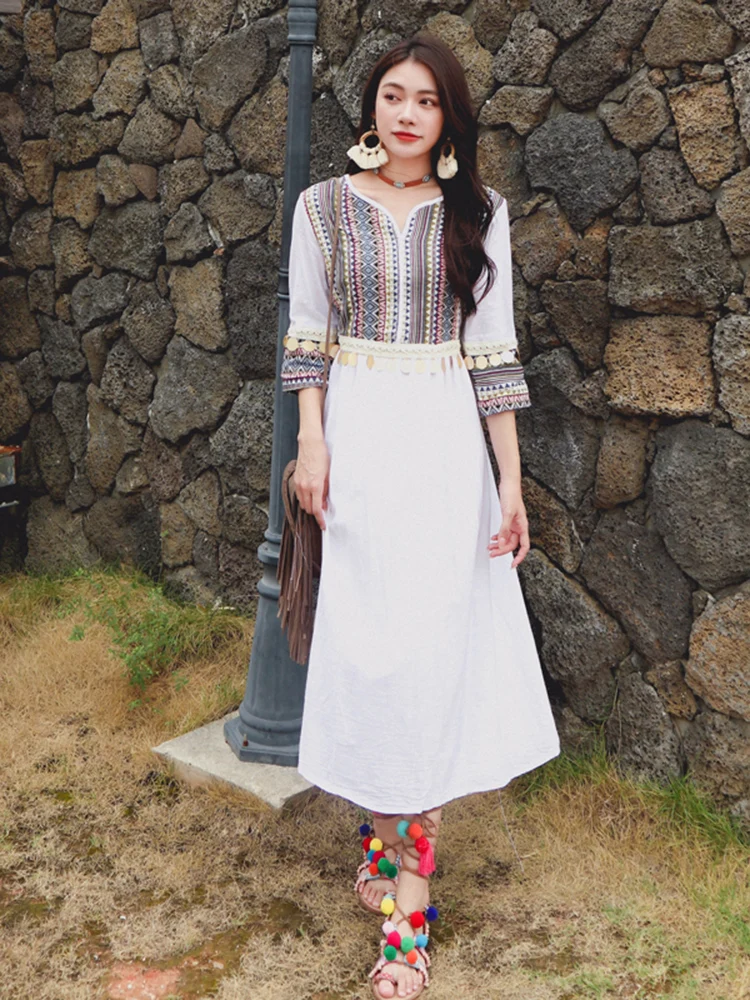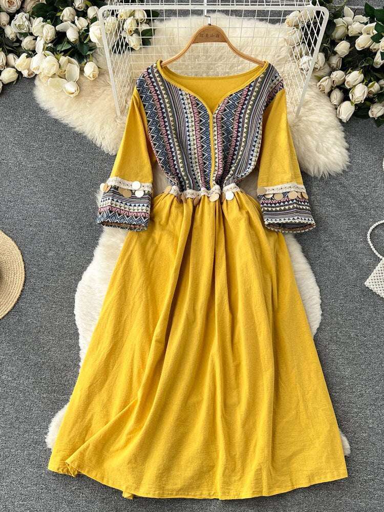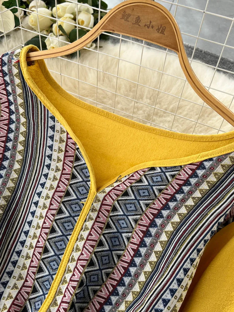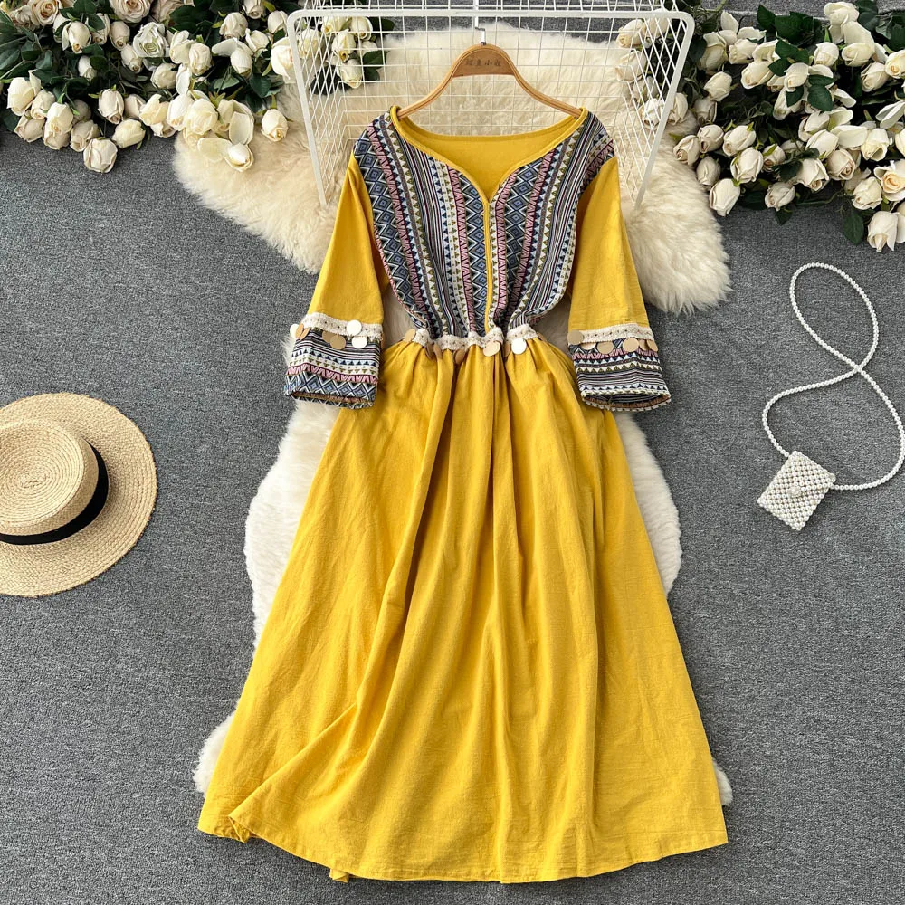 Znbbw Summer High-end Sense of Cold Wind Waist Thin Printed Long-sleeved Female Dress Beautiful V-neck Long Dress Women D1490