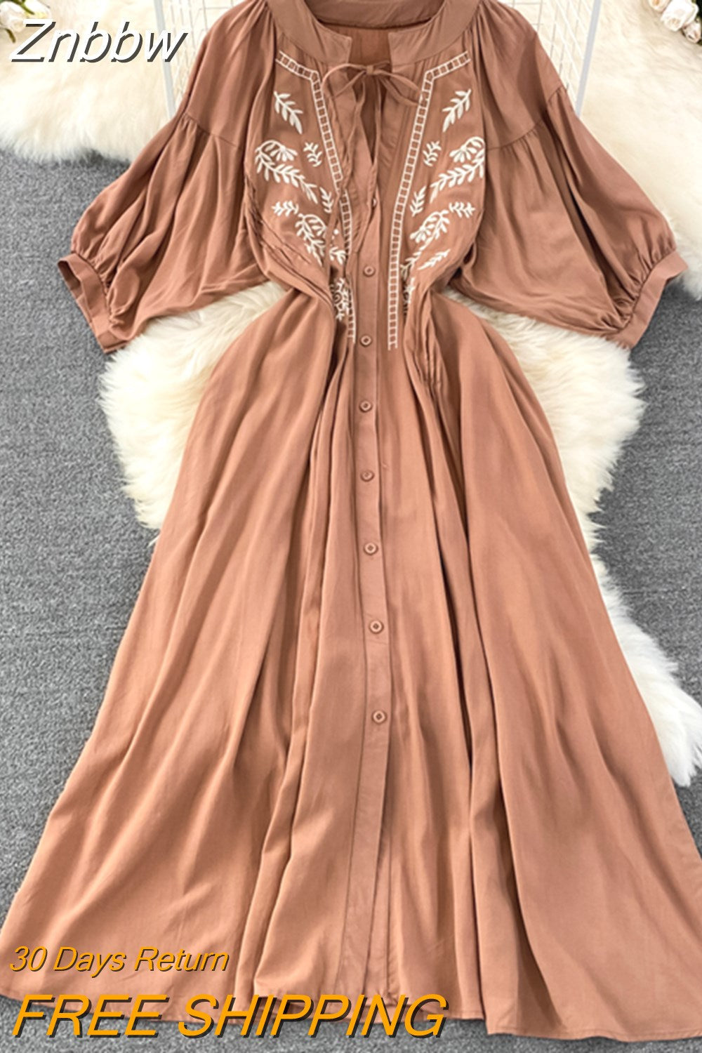 Znbbw Summer Retro Temperament Embroidered V-neck Single-breasted Loose Dress Female Elegant Large Swing Vestidos Women D1575