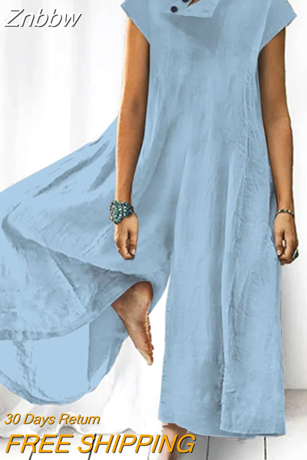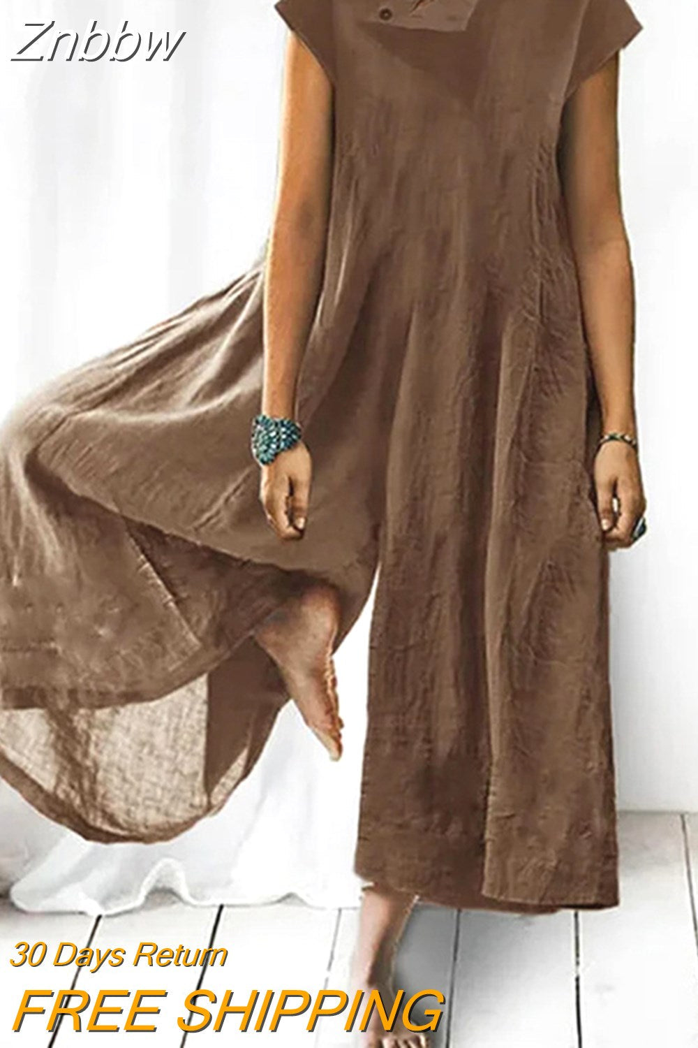 Znbbw Button Stand Neck Short Sleeve Romper Solid Loose Wide Leg Pants Playsuits Summer Women Clothing Cotton Linen Jumpsuits