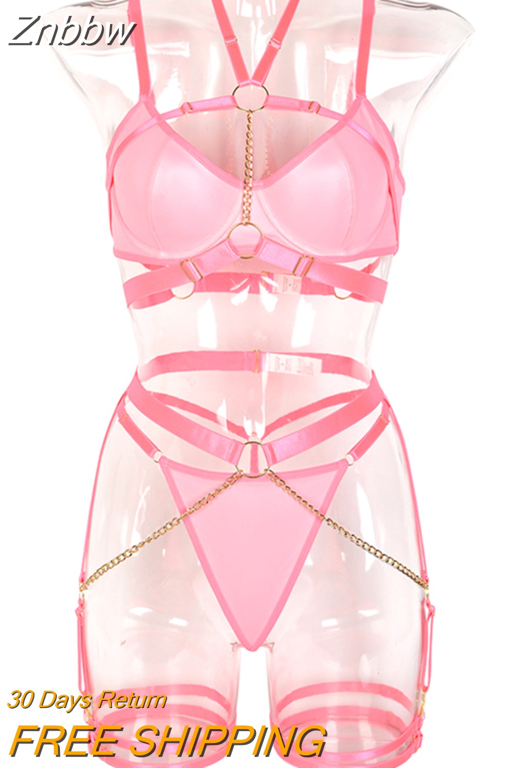 Znbbw Latex Lingerie Erotic Leather Underwear For Women Halter Bra Bra And Panty Set Sexy PVC Outfit With Chain 4-Piece