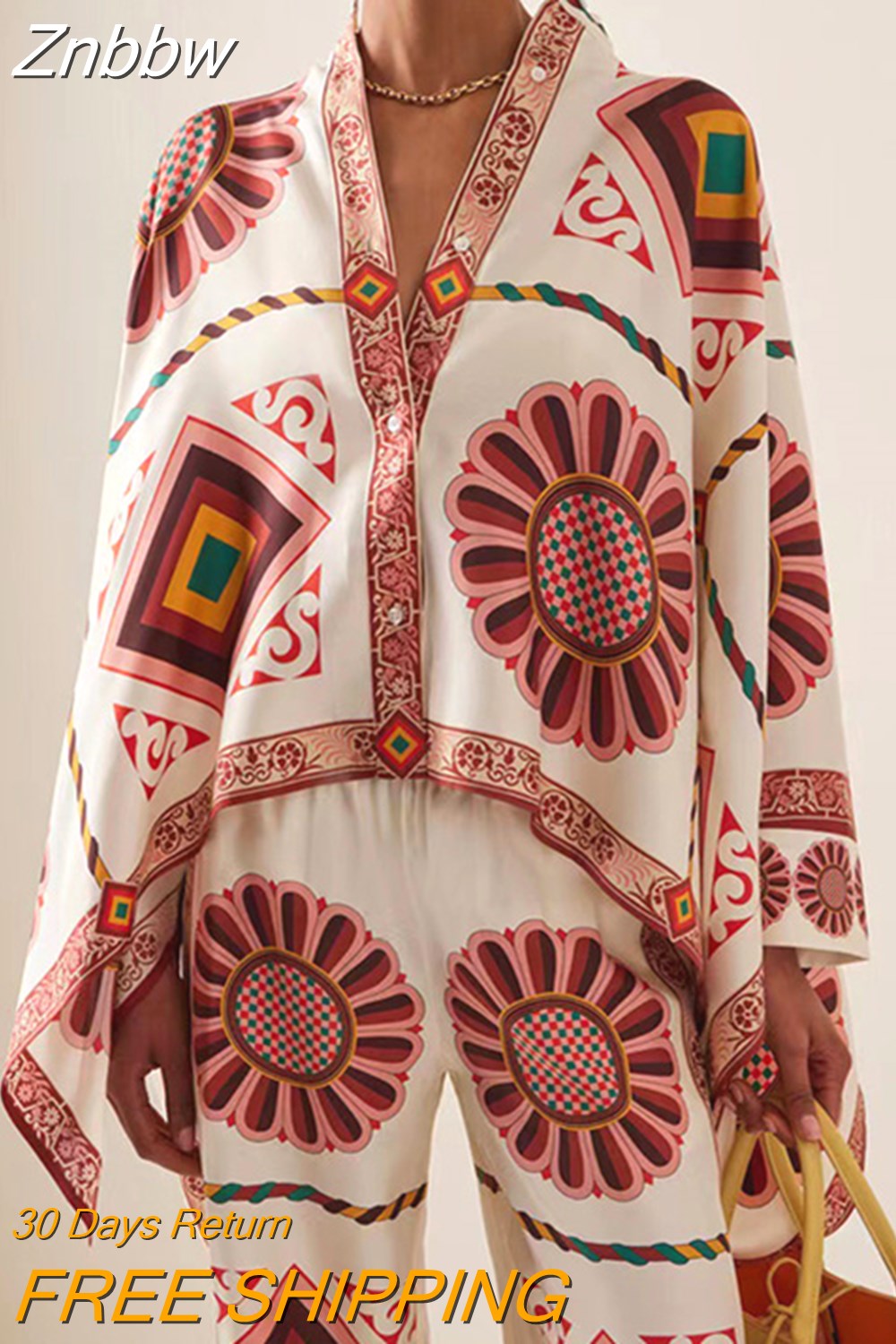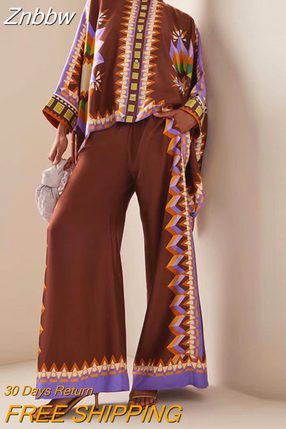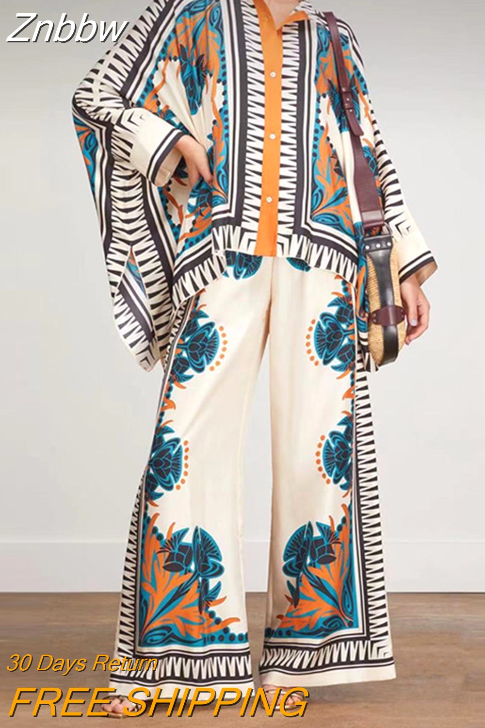 Znbbw Loose Boho Outfits Vintage Pattern Printed Two Piece Set Fashion Stand Neck Batwing Sleeve Shirt+Long Pants Women's Suits