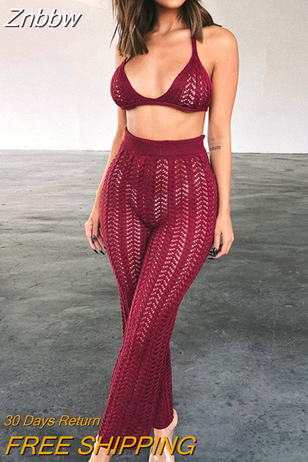 Znbbw Sexy Hollow Out Knitted Pant Suits Women Crochet Crop Top And Wide Led Pants Summer Two Piece Set Ladies Casual Beachwear