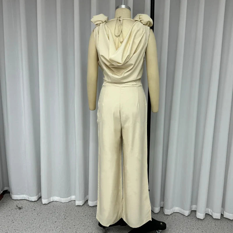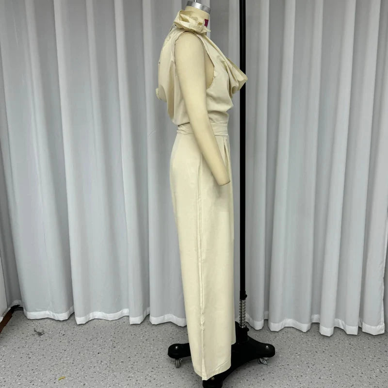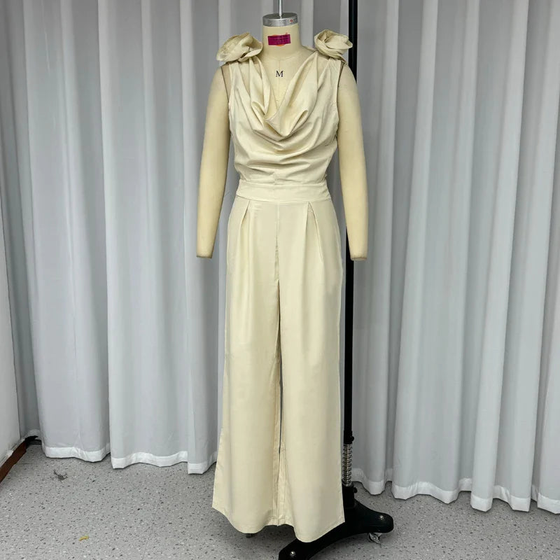 Znbbw Women Jumpsuits Summer Fashion Temperament Cowl Neck Sleeveless Solid Rose Nipped Waist Wide Leg Pants Rompers High Stree