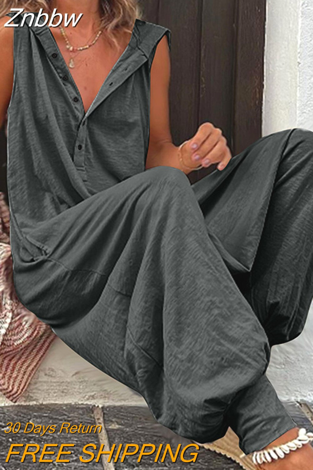 Znbbw Women Solid Hooded Jumpsuit Summer Casual V-neck Sleeveless Button Cross-pants Streetwear Female Loose Retro Romper Playsuits