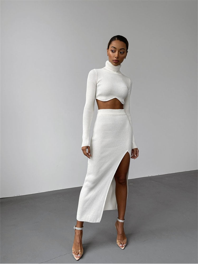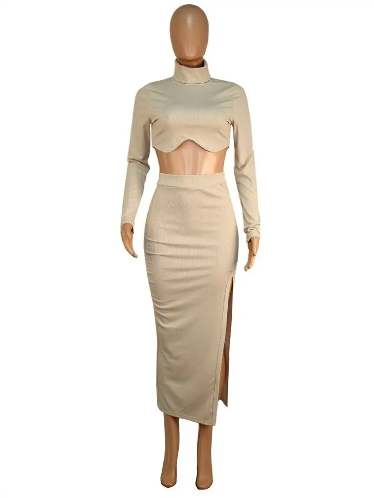 znbbw Autumn Sexy Solid Ribbed 2 Two Piece Sets Club Outfit For Women 2023 Long Sleeve O Neck Crop Top And Skirt Sets Female