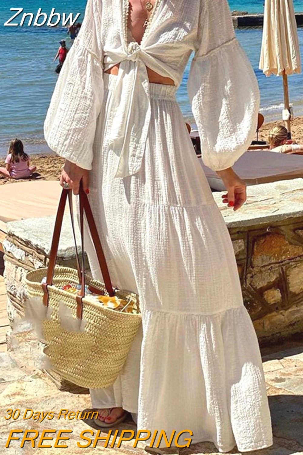 Znbbw Deep V Puff Sleeve Tie Up Top with Long Skirts Holiday Suit Casual Beach Party Women Two Piece Set 2023 Summer Loose Outfit