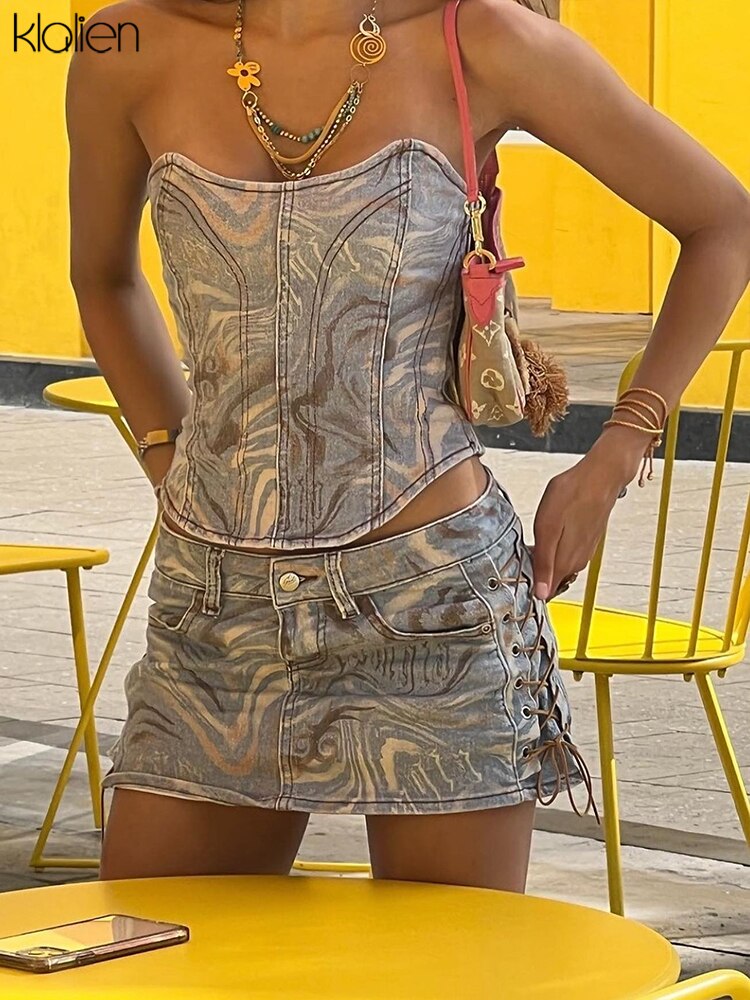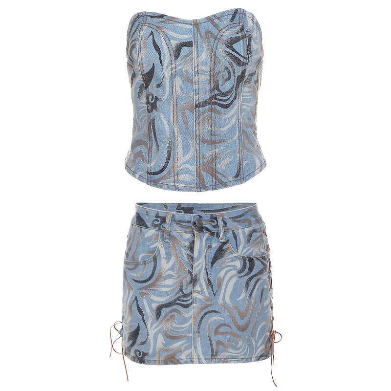 Znbbw Denim Two Piece Set for Women Summer Sexy Strapless Backless Crop Top and Mini Skirt Set Streetwear y2k Matching Suit