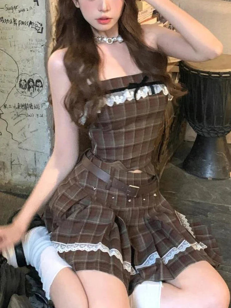 Znbbw Fashion Vintage Elegant Plaid 2 Piece Set Women Summer Lace Party Mini Skirt Suit Female Preppy Style Bow Retro Set 2024