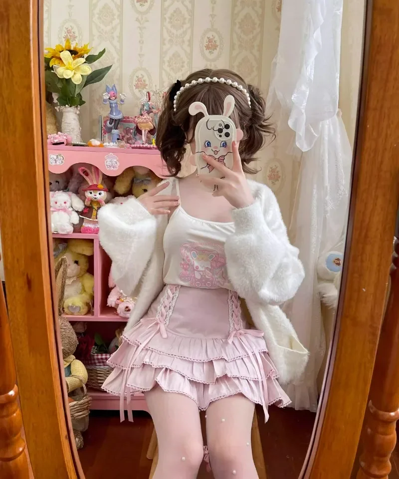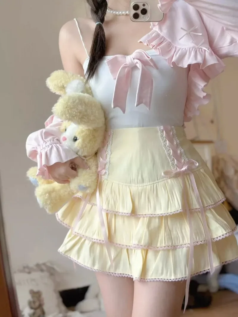 Znbbw Kawaii Lolita Style Pleated Skirts Women High Waist Pink Bandage Fairy Y2k Aesthetic Skirt Cute Faldas Mujer Moda 2024