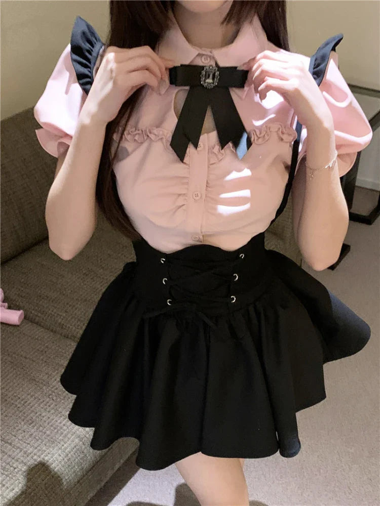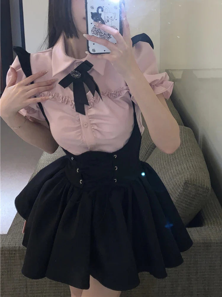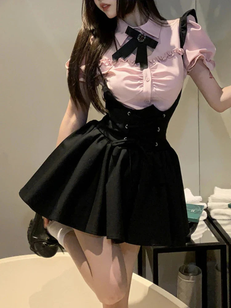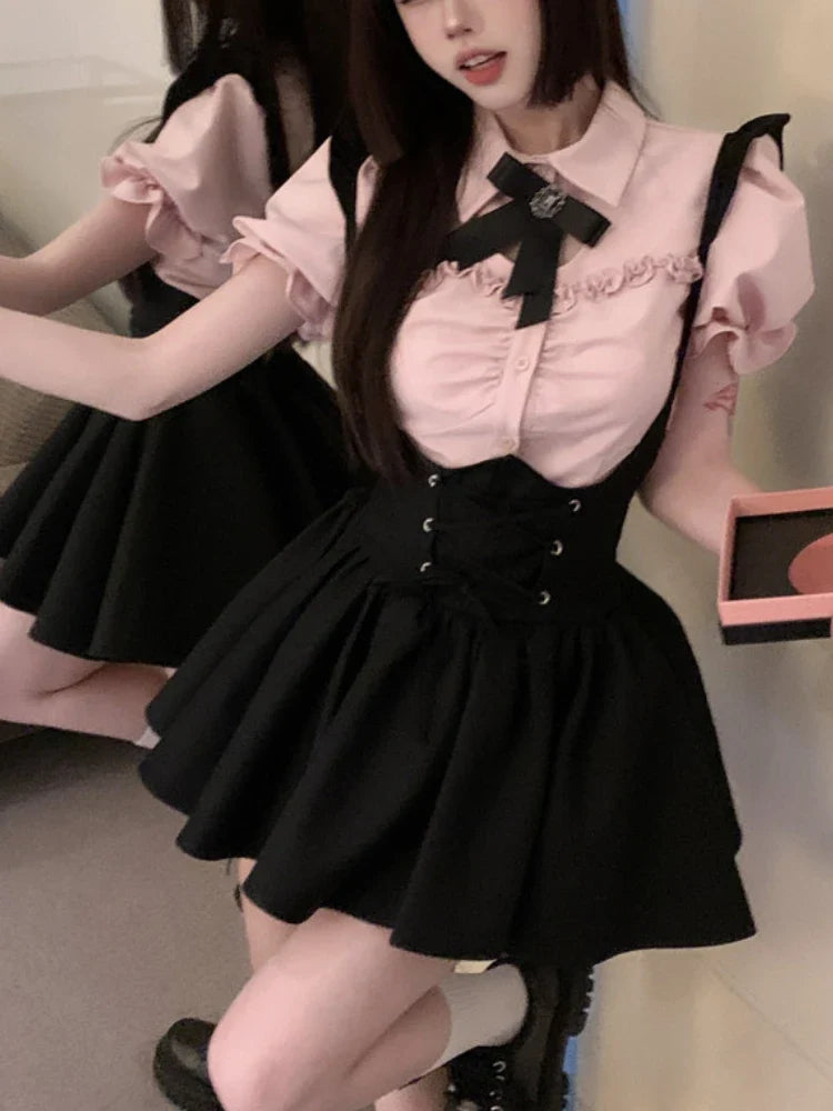 Znbbw Kawaii Sweet Two Piece Set Women Korean Style Y2k Party Skirts Suit Female Pink Puff Sleeve Blouses£«Suspenders Mini Dress