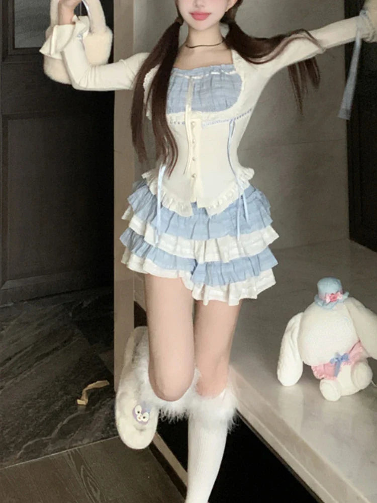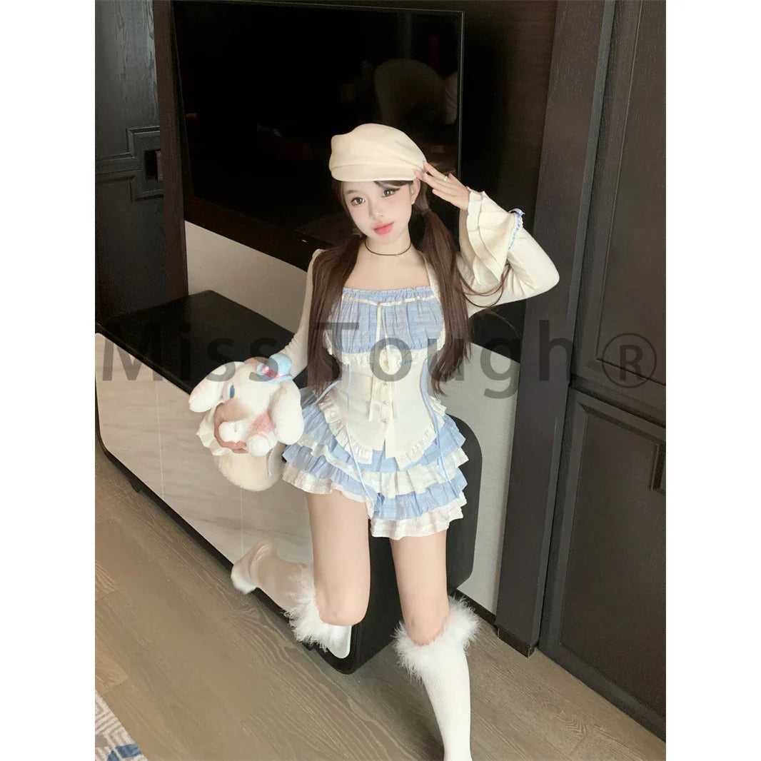 Znbbw Lolita Kawaii Two Piece Set Women Casual Lace Y2k Sweet Mini Skirt Suit Female Korean Fashion Japanese Desinger Set 2024