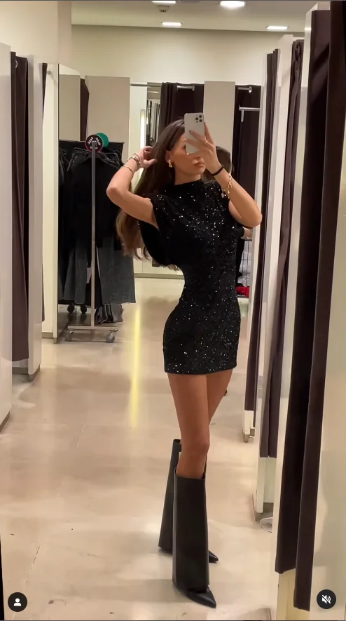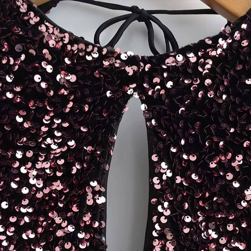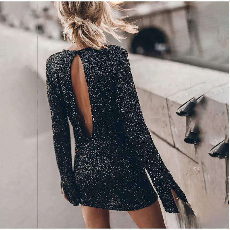 Znbbw Long Sleeve Sequin Mini Skirt for Women Elagant Slim Backless Short Dresses Autumn Spring Lady Solid Sexy Party Skirts