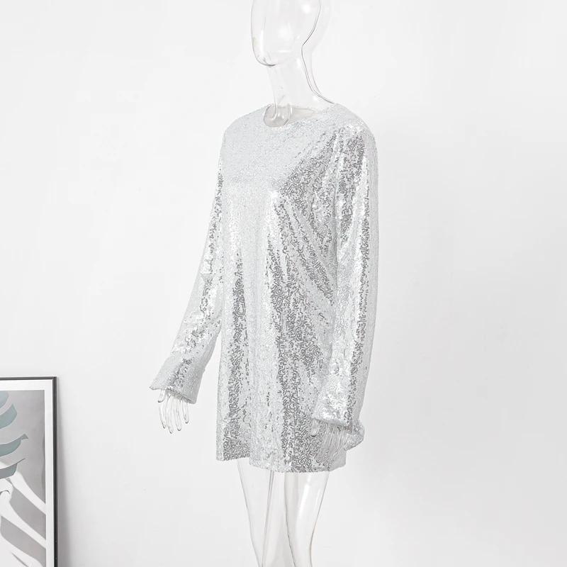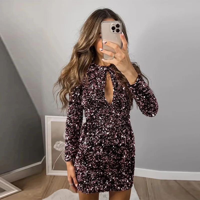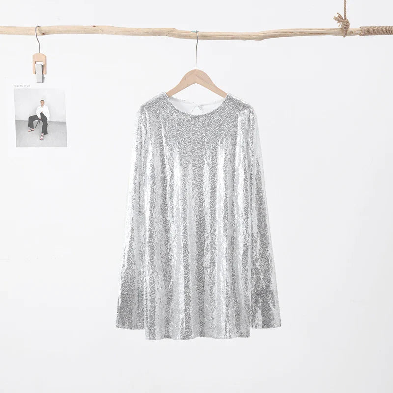 Model Number: Long-sleeved O-neck Sequin Short Dress