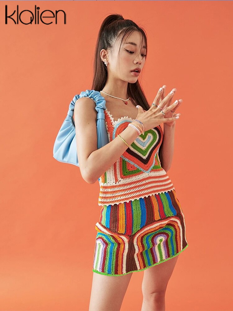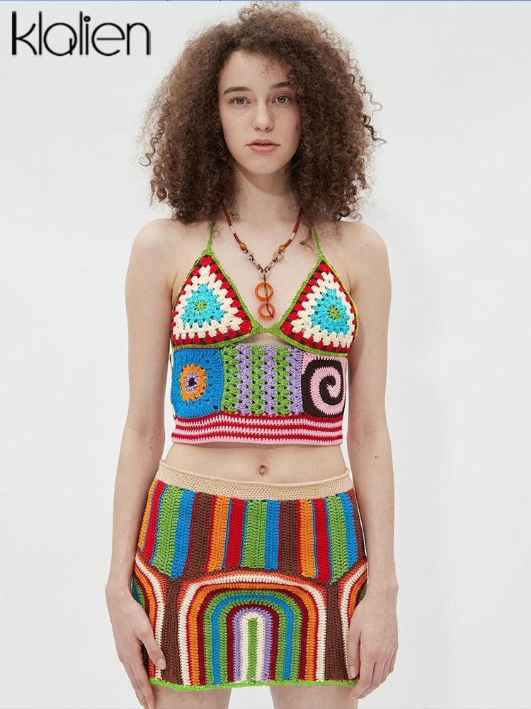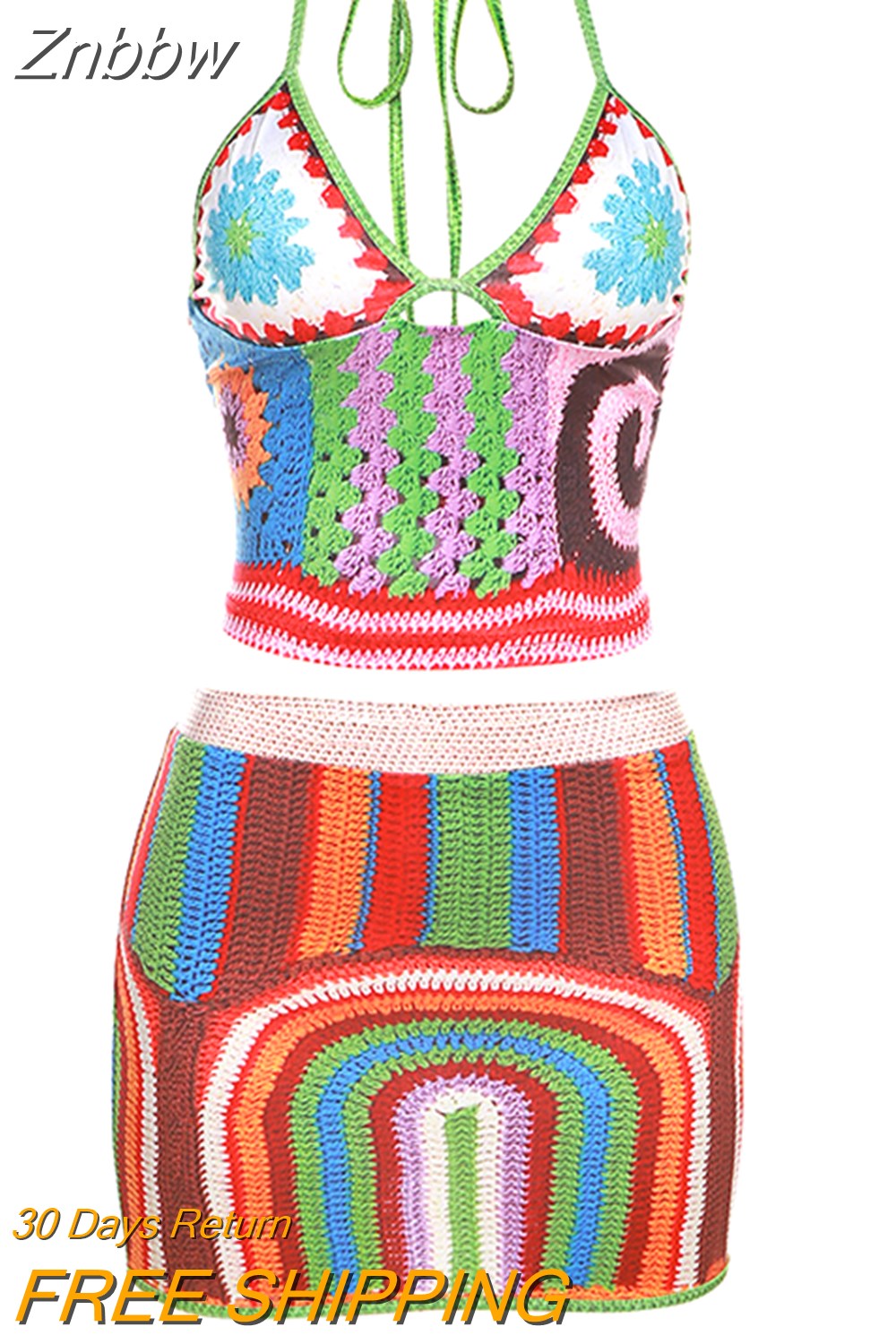 Znbbw Multicolor Knitted Two Piece Skirt Set Women Summer Outfit Sexy Halter Crop Top and Elastic Waist Mini Skirt Beachwear 0410