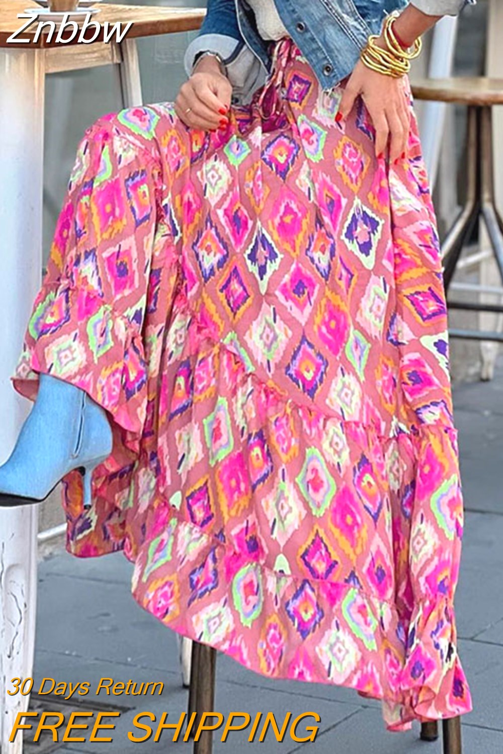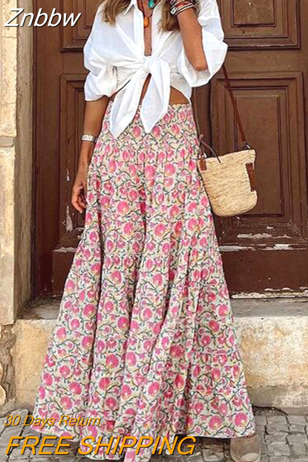 Znbbw Party Women Ruffle Half-length Long Skirt Summer Bohemian Floral Print A-line Skirt Casual High Waist Pleats Beach Skirt