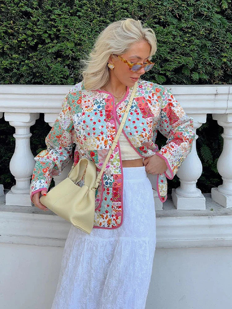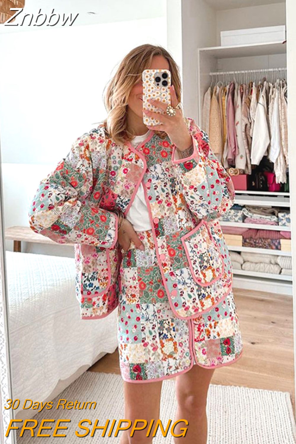 Znbbw Patchwork Cotton Jackets Mini Skirt Suit For Woman 2023 Autumn Thicken Warmth Short Coats Set Female Printed Streetwear