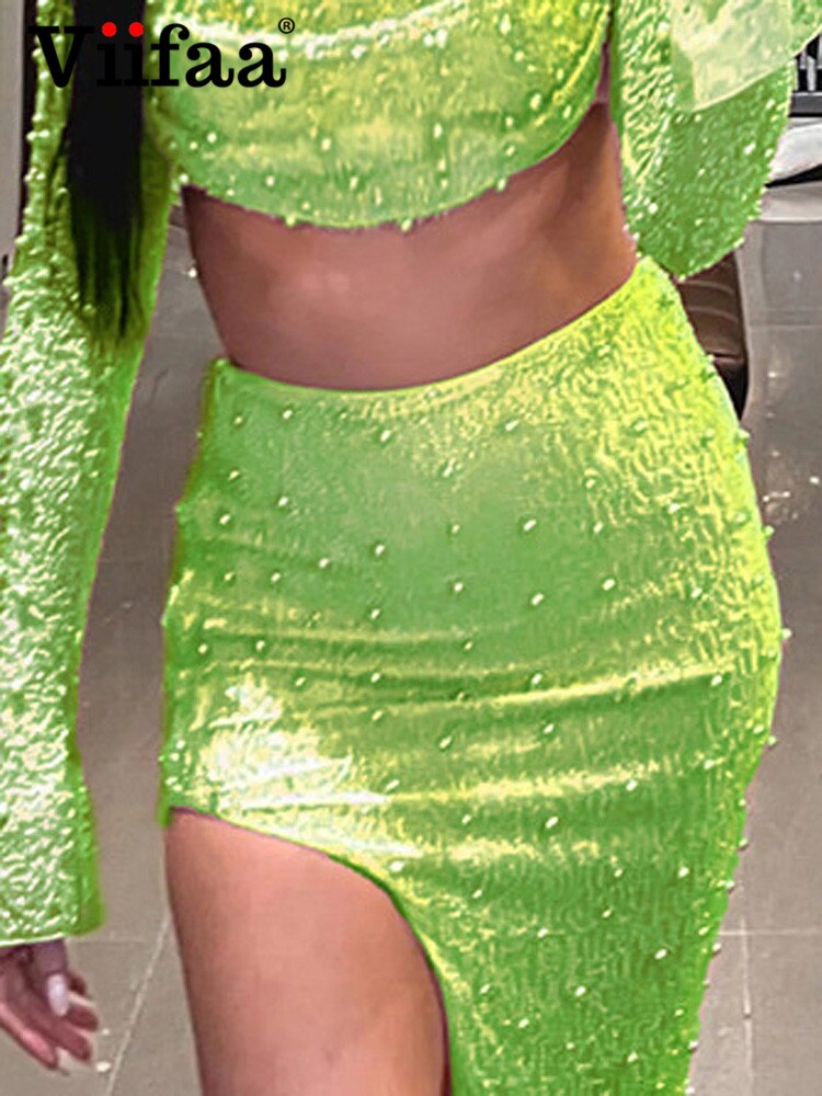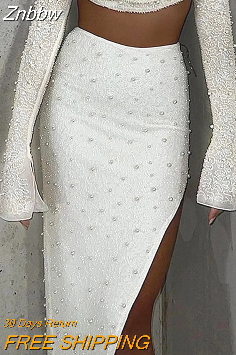Znbbw Pink Beaded Y2K Midi Skirts for Women High Waist Bodycon Birthday Night Party Split Sexy Long Skirt