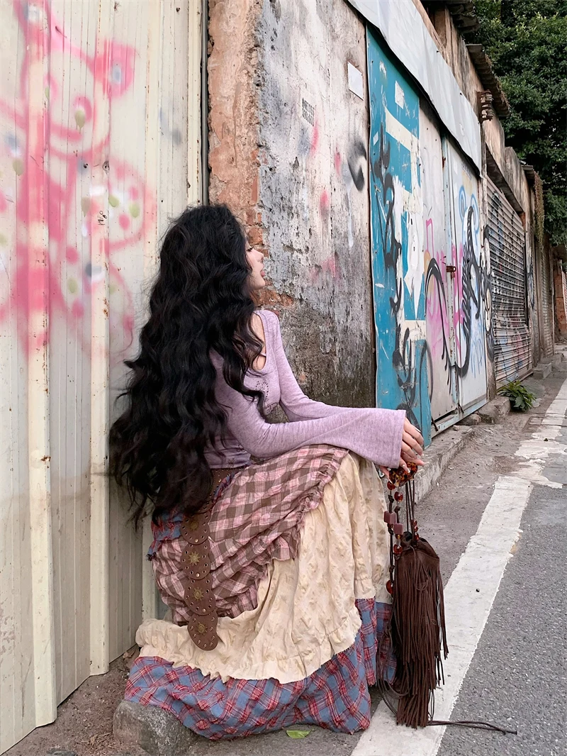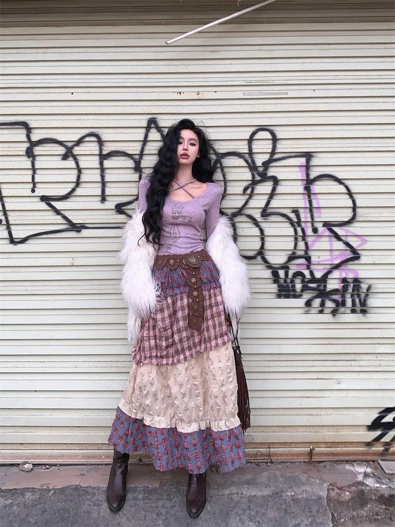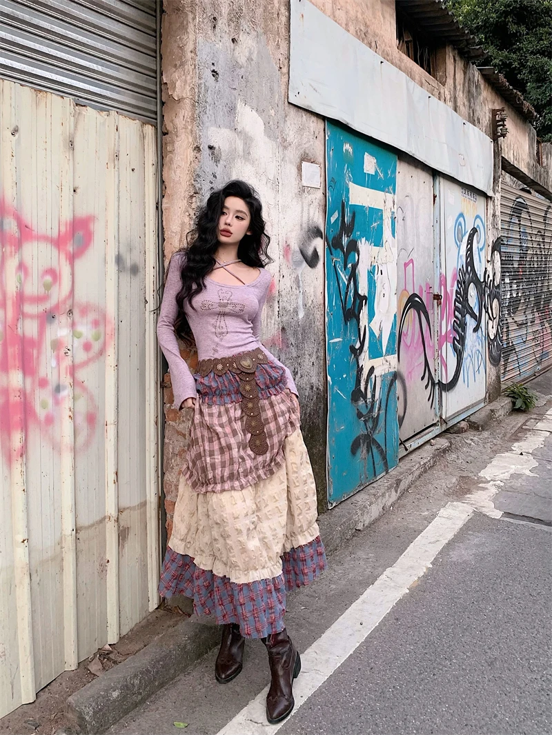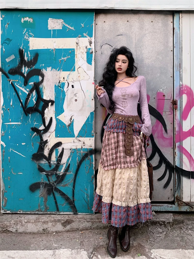 Znbbw Plaid Midi Skirt Women Y2K Harajuku Patchwork A Line Skirts Summer Streetwear Korean High Waist Contrast Casual Skirt