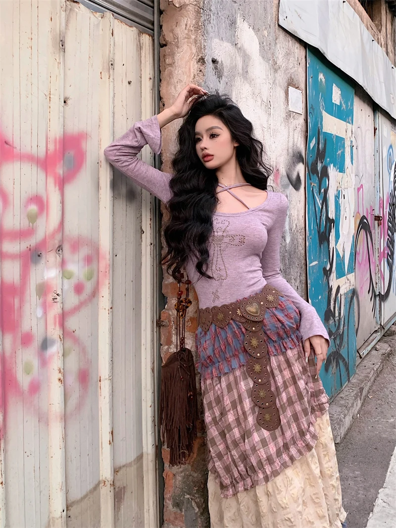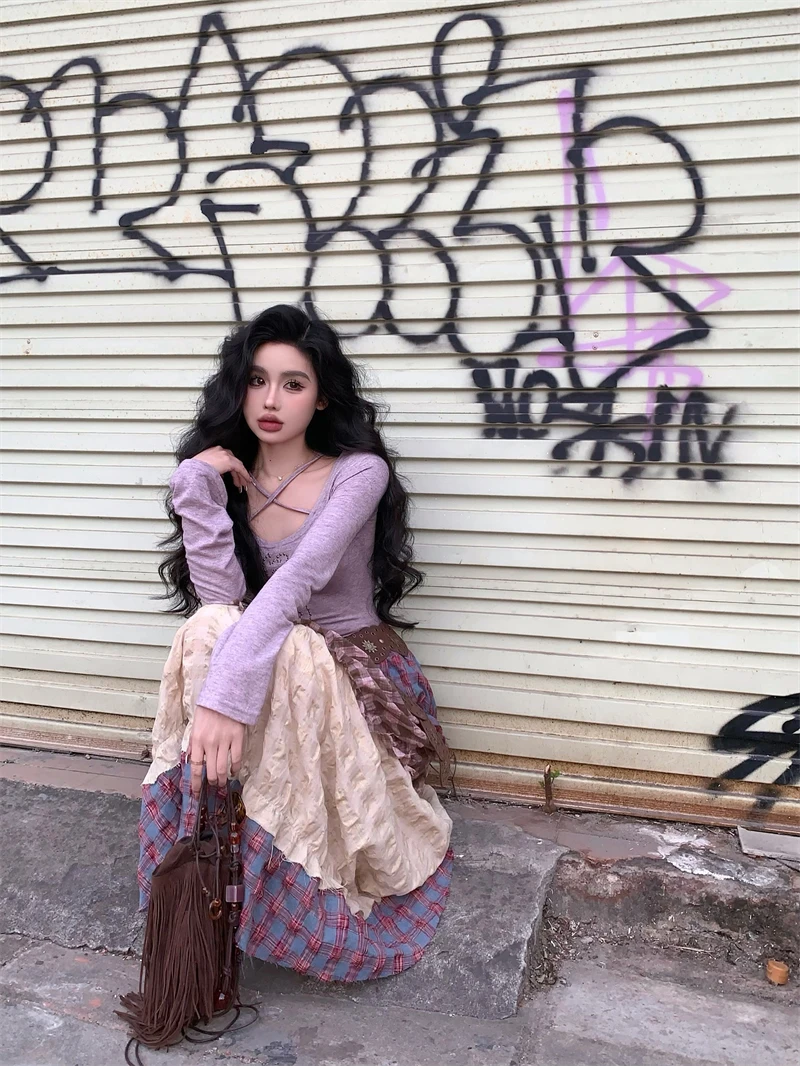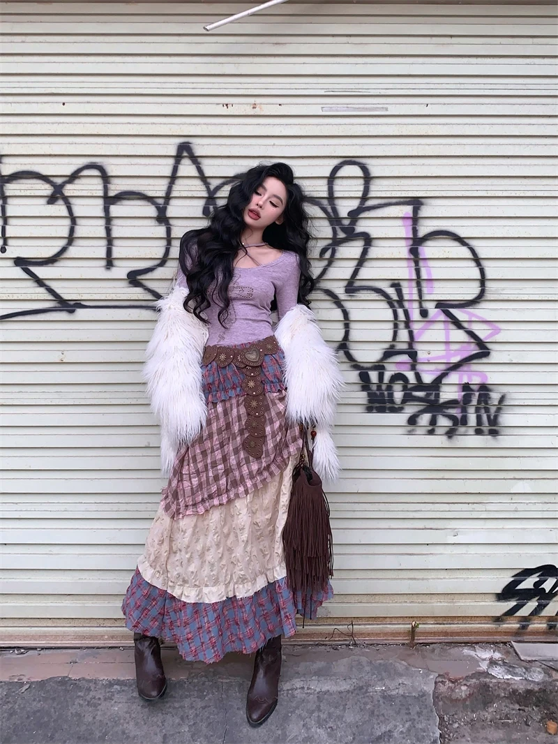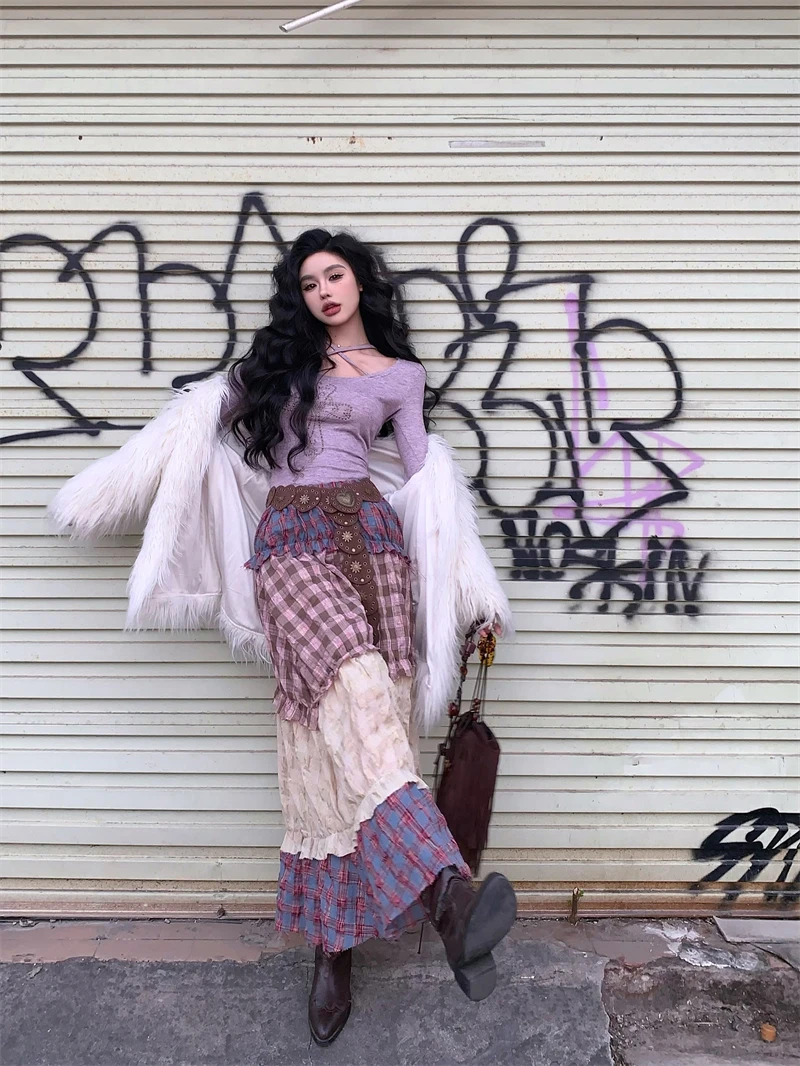 Znbbw Plaid Midi Skirt Women Y2K Harajuku Patchwork A Line Skirts Summer Streetwear Korean High Waist Contrast Casual Skirt