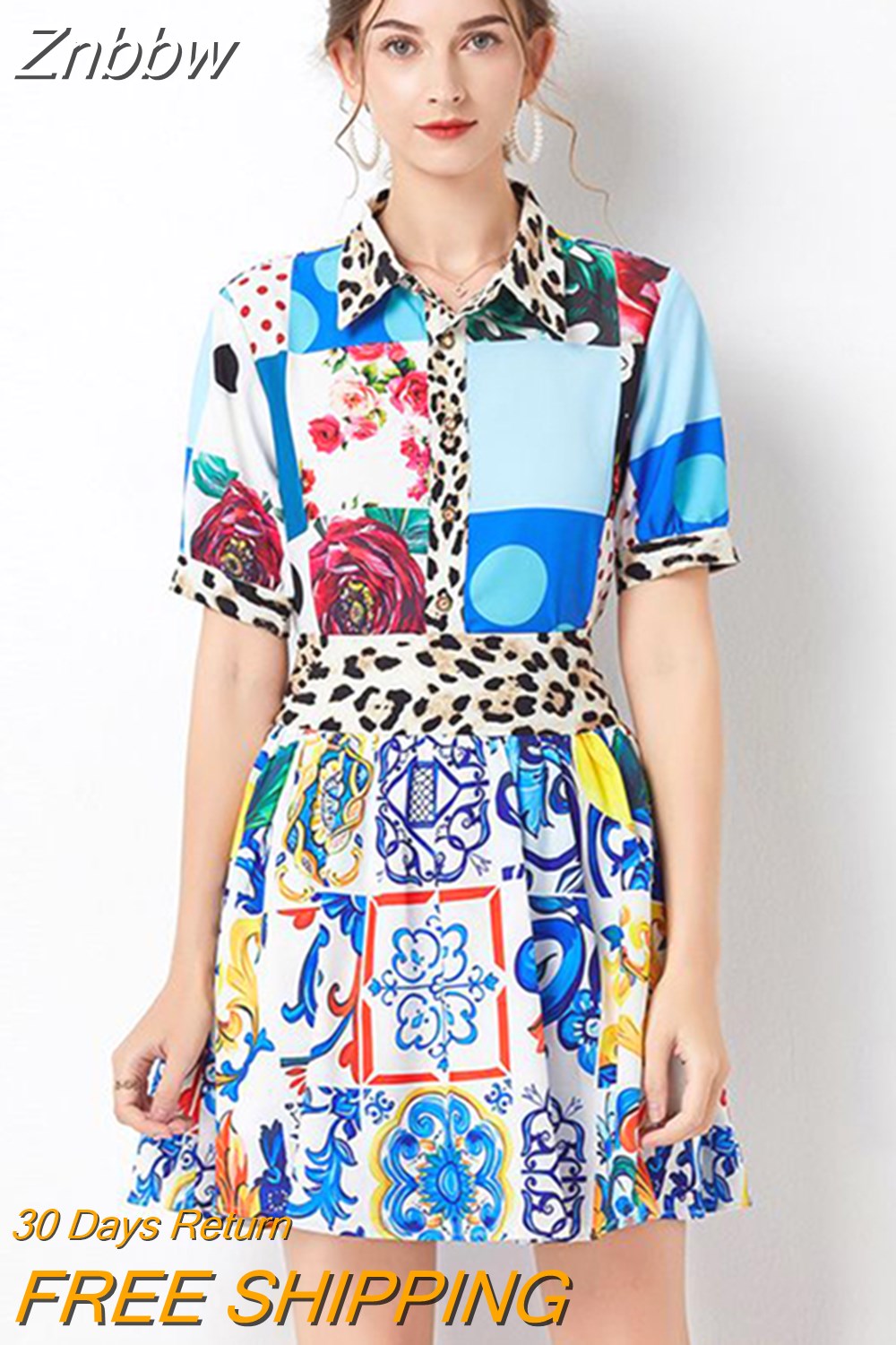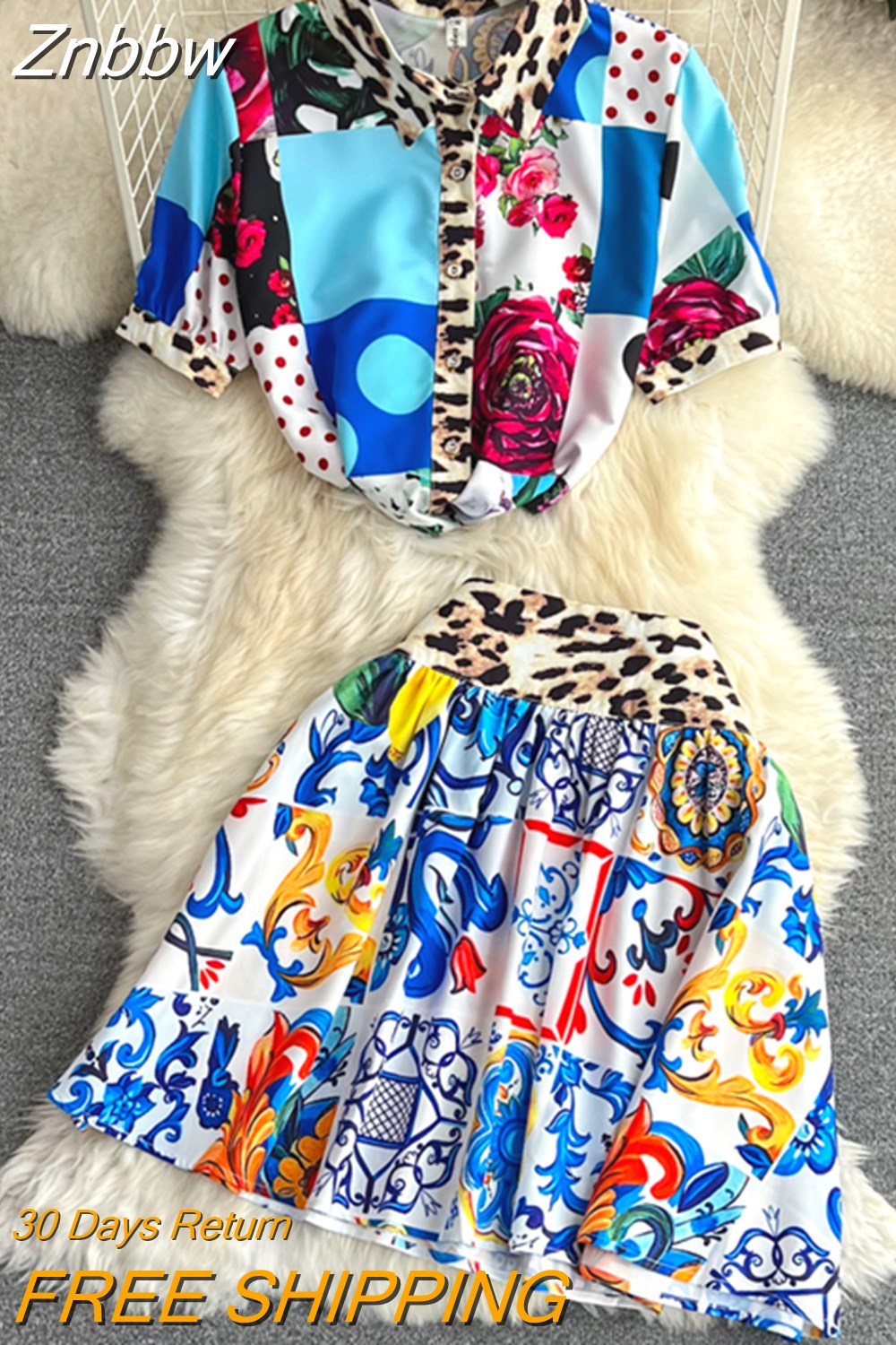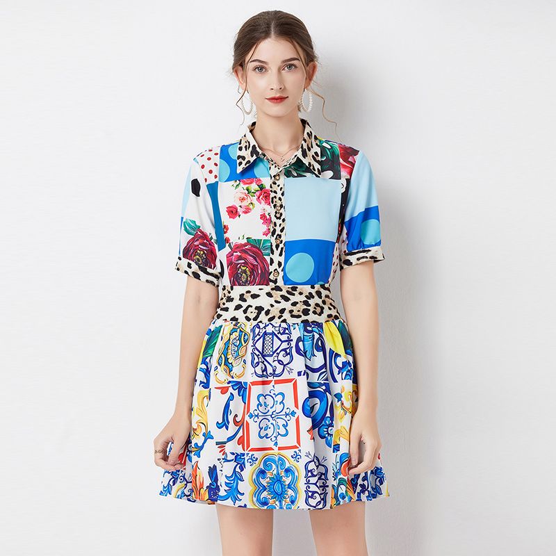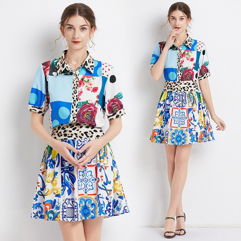 Znbbw Runway Blue And White Porcelain Printed Beach Set Women Flower Short Sleeve Print Tops + Mini Skirt 2 Piece Set N8427