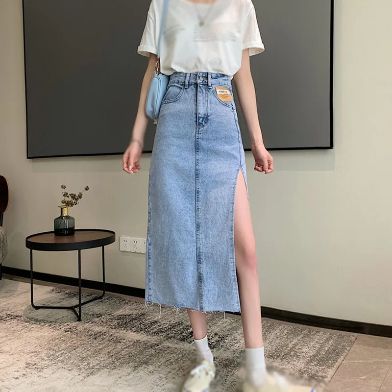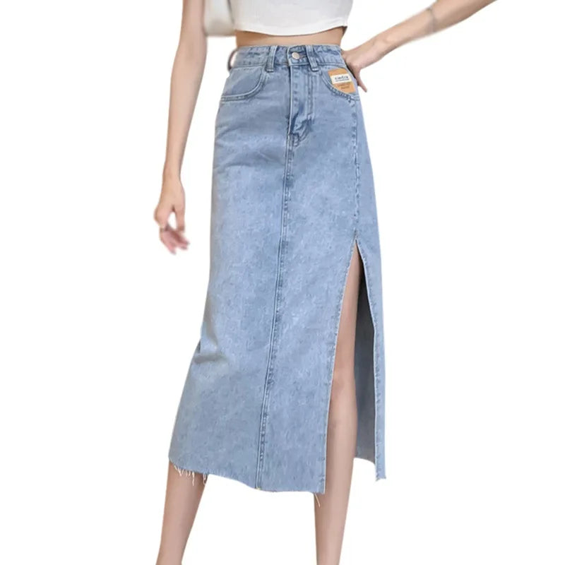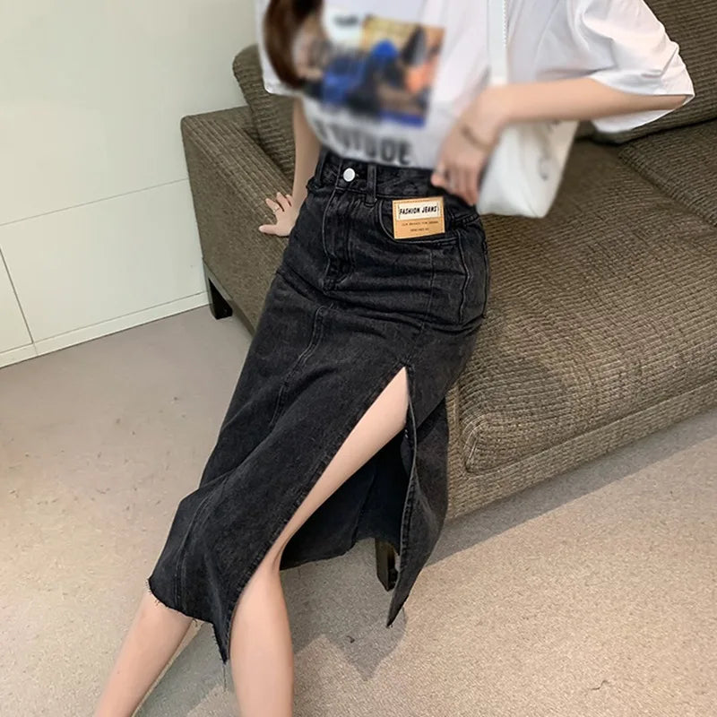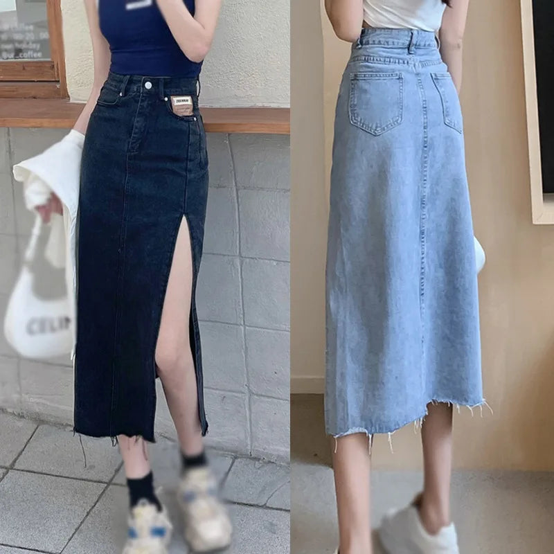 Znbbw Skirts Women A-line Solid Slim Side Slit Long High Waist Denim Skirt Wrap Hip Streetwear