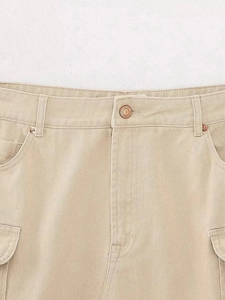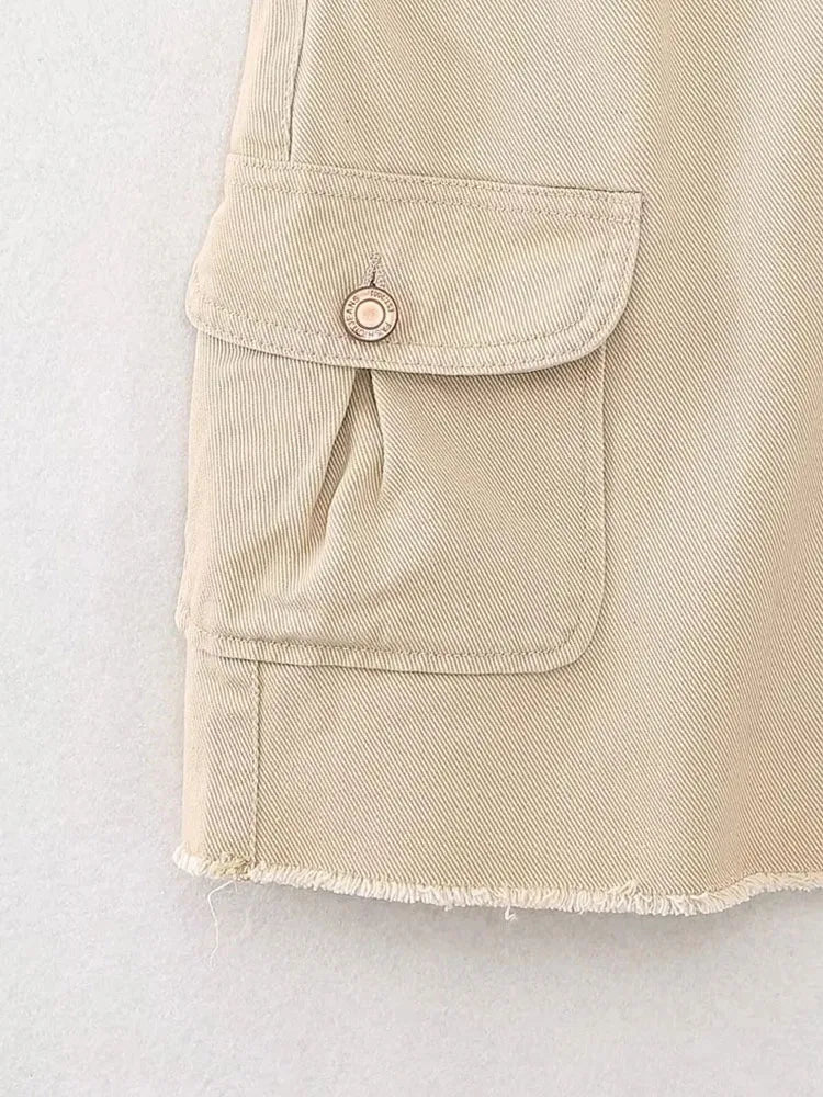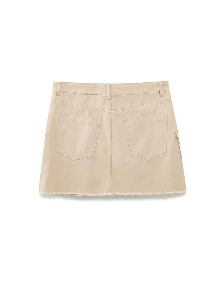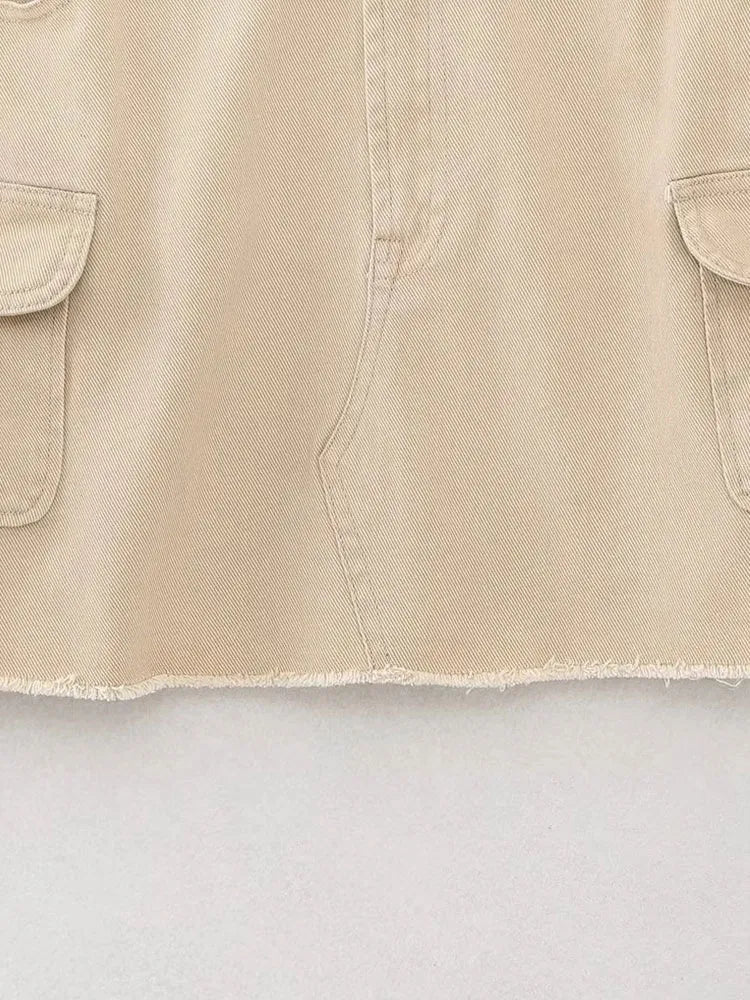 Znbbw TRAF 2023 Women Safari Style Pocket Patch Denim Mini Skirt Faldas Mujer Office Lady Chic Zipper Fly Slim Vestidos